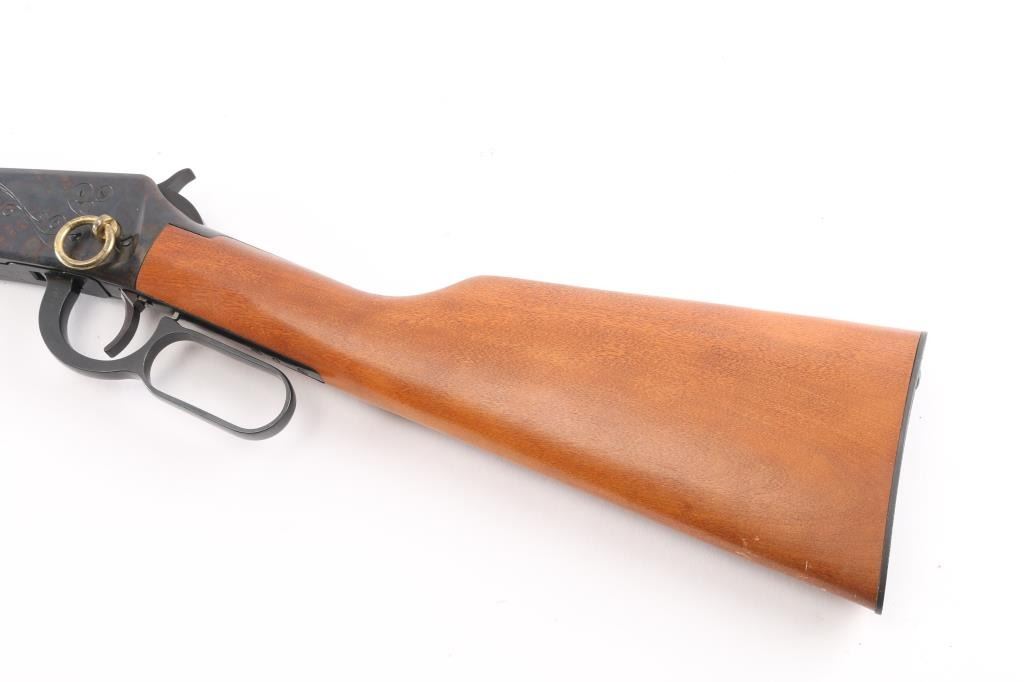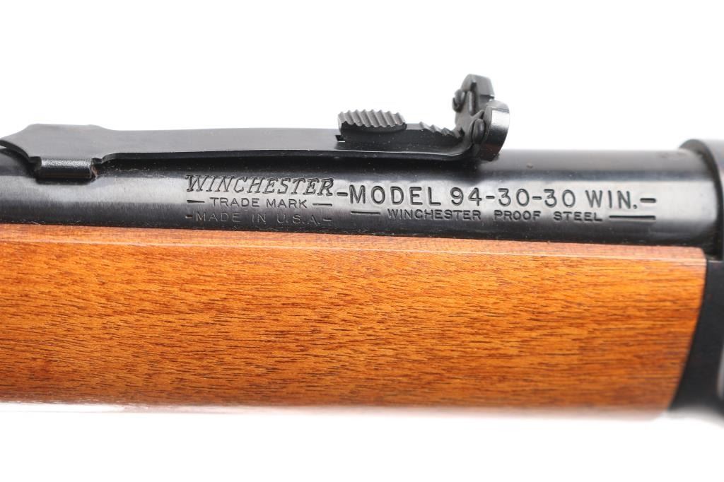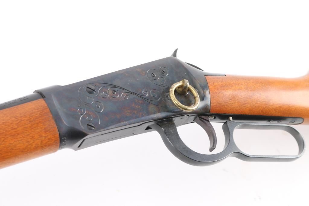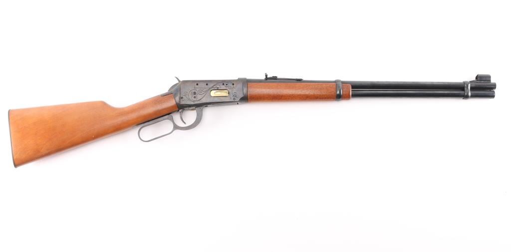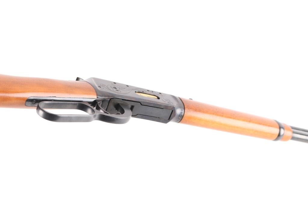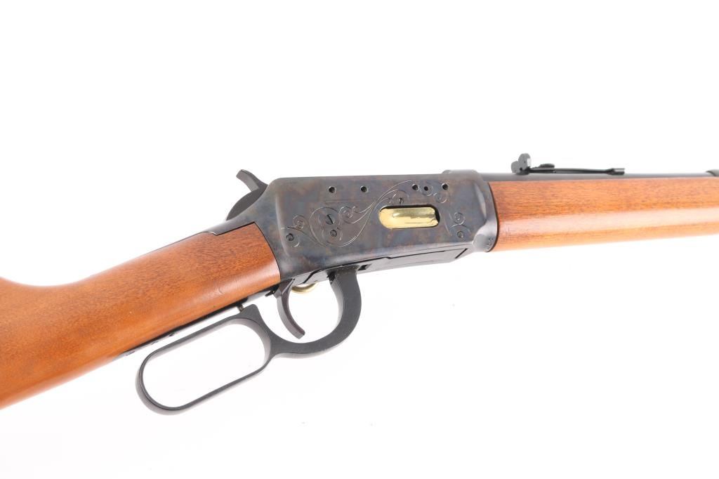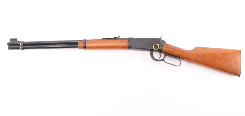 Antique Model. (1964-86) Vintage lever action repeating SRC carbine. chambered in .30-30 Winchester. Manufactured 1966. Features a blued, case colored, "Special" receiver finish, 20" barrel, full-length tube magazine, hooded ramped, blade/bead front sight , adjustable rear buckhorn sight. Smooth trigger, serrated hammer spur, steel receiver, smooth walnut forend and straight wrist shoulder stock with factory checkered steel buttplate. Left receiver drilled/tapped for sights/optics. The saddle ring and loading gate are gold toned and receiver has minimal scroll engraving. Bore is excellent/bright Retains about 98% finish Wood is excellent. Markings are crisp. Action is smooth.NRA Condition-Excellent. C&R Firearm.