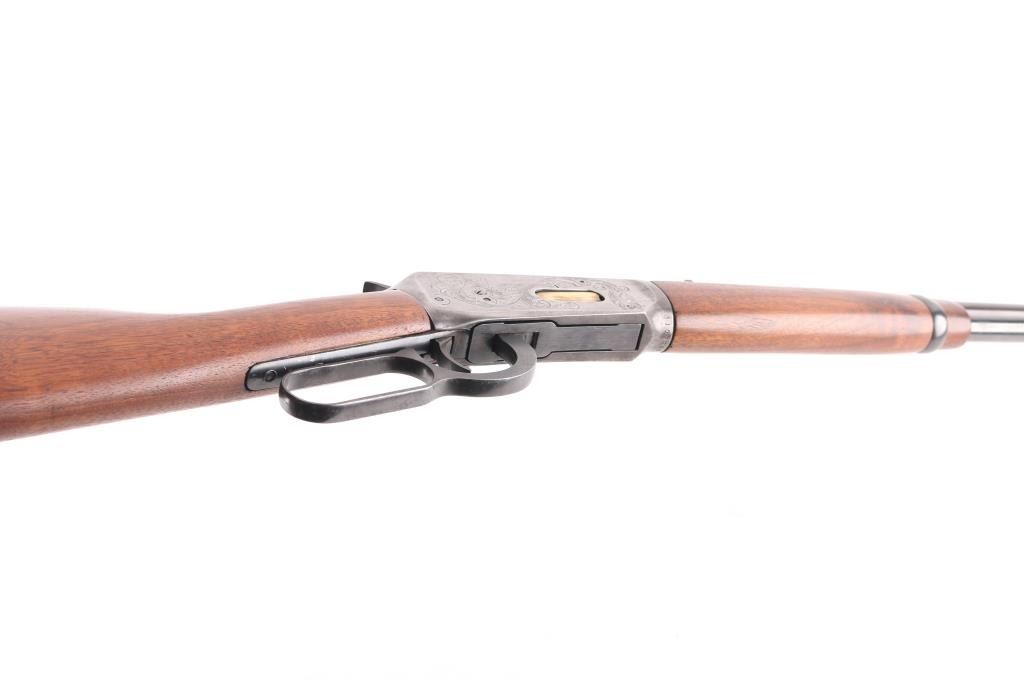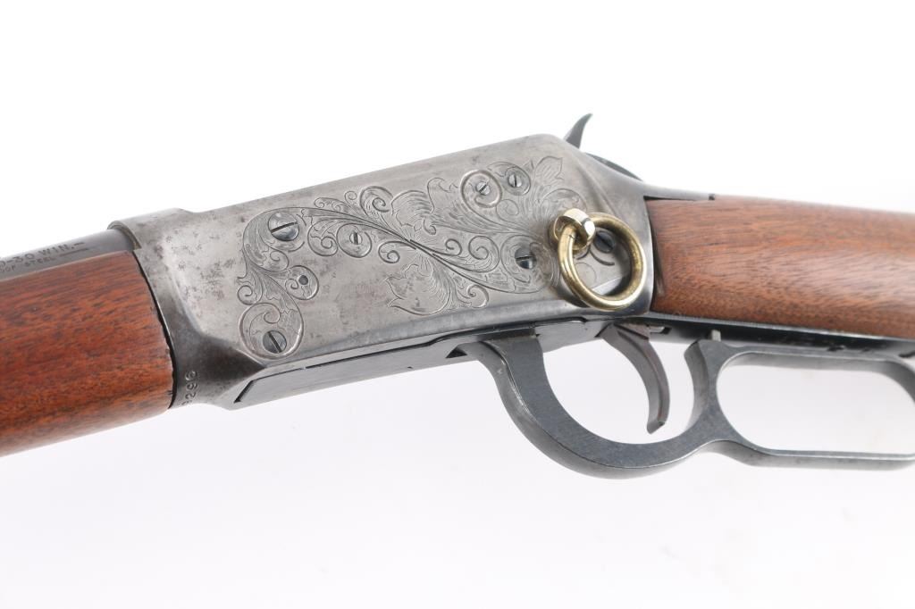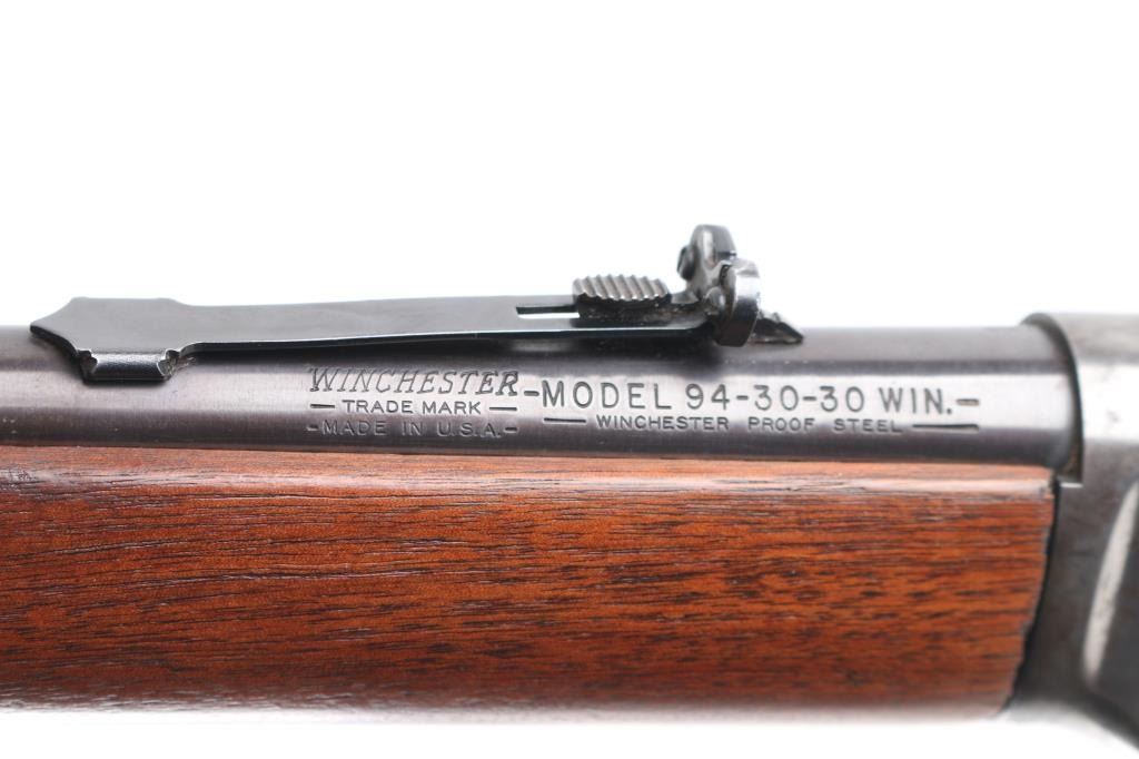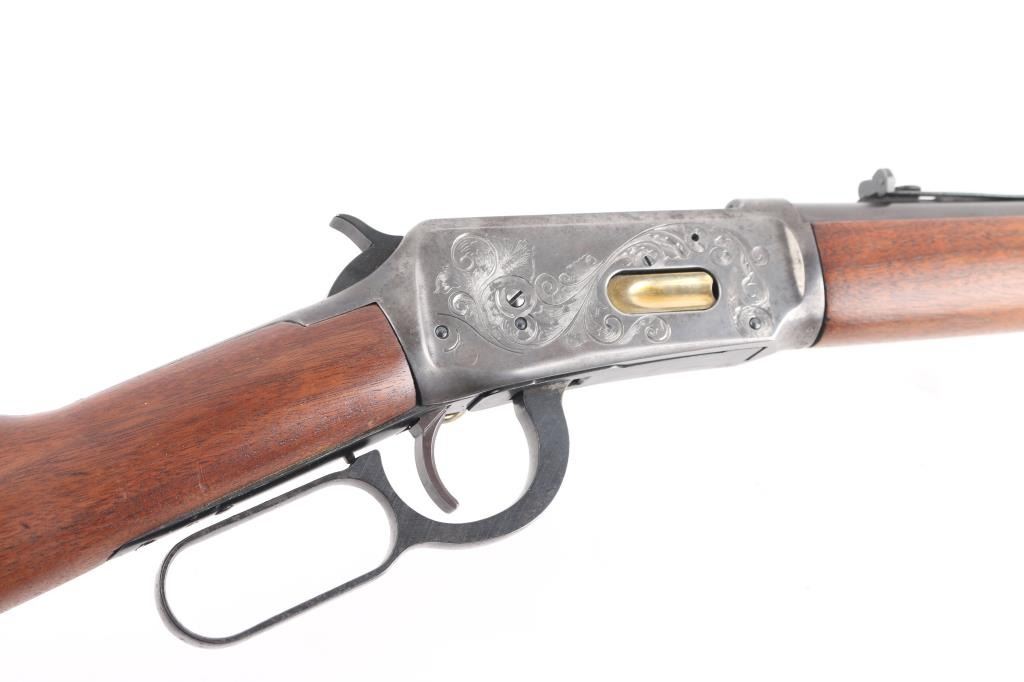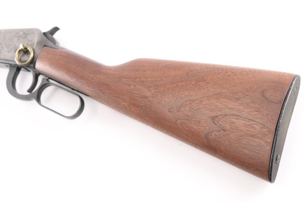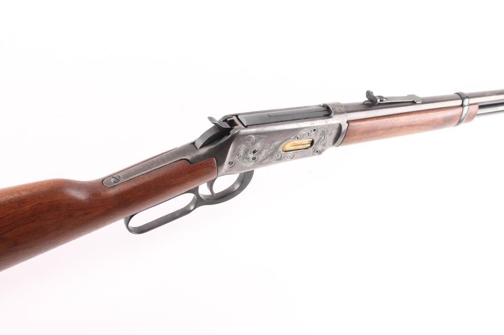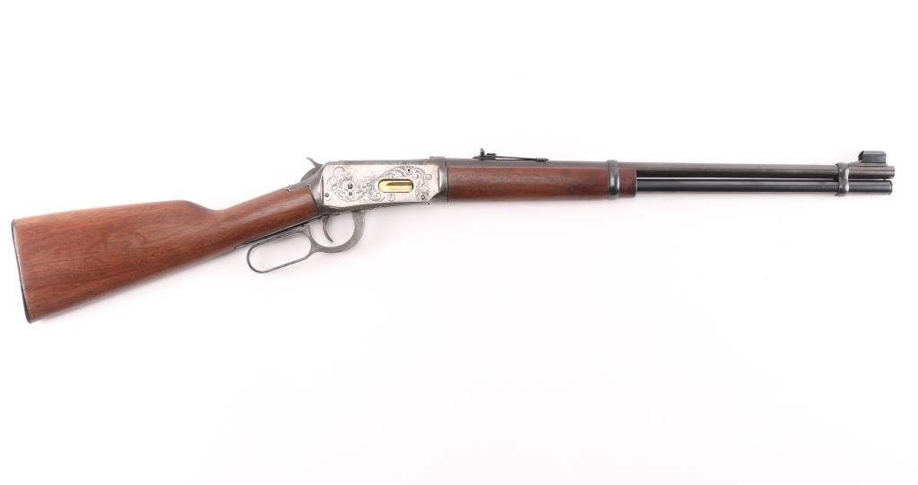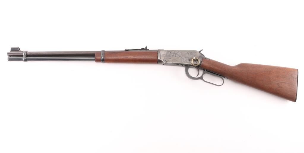 Antique Model. (1964-86) Vintage lever action repeating SRC carbine. chambered in .30-30 Winchester. Manufactured 1967. Features a blued finish, case colored, "special" receiver, 20" barrel, full-length tube magazine, hooded ramped, blade/bead front sight , adjustable rear buckhorn sight. Smooth trigger, serrated hammer spur, steel receiver, smooth walnut forend and straight wrist shoulder stock with factory checkered steel buttplate. Left receiver drilled/tapped for sights/optics. The saddle ring and loading gate are gold toned and receiver has factory floral, scroll engraving. Bore is excellent/bright Retains about 96% blue finish with some minor scuffs on the lower tang, the "Case colored receiver is in the white with traces of case color, engraving is sharp. Wood is excellent. Markings are crisp. Action is smooth.NRA Condition-Very Good. C&R Firearm.