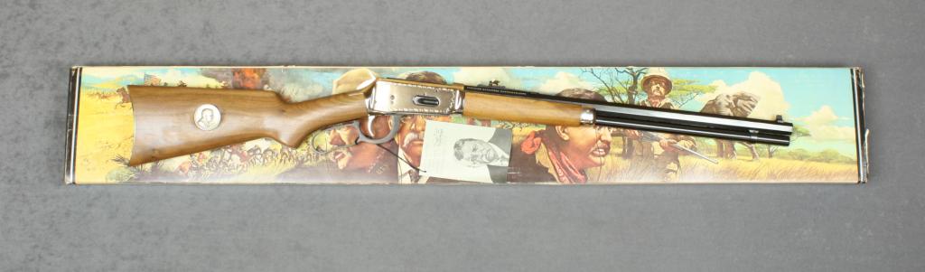 Winchester Model 94 Theodore Roosevelt Commemorative lever action rifle in like new condition and in factory box with factory cover sleeve, 20” octagon barrel, black and nickel finish, .30-30 cal., wood stocks,#TR33131. One of the most collected Models of this Commemorative series. Est.: $400-$800.
