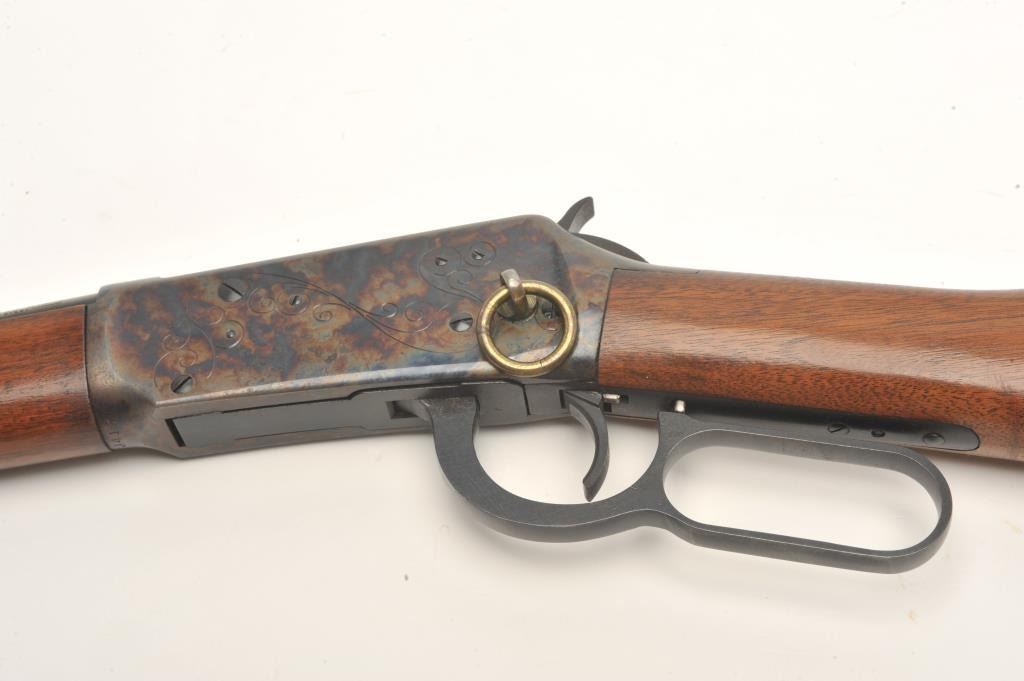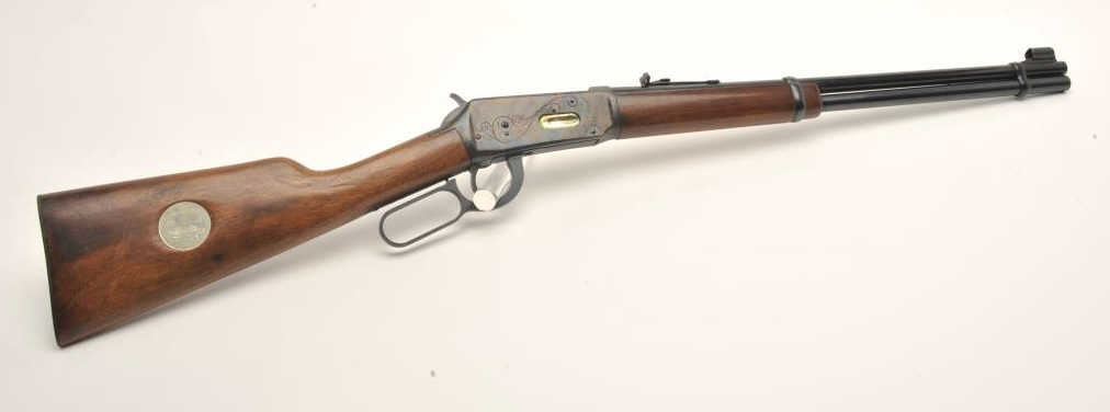 Winchester Model 94 lever action SRC, Wyoming 75th Diamond Jubilee Commemorative, .30-30 Win. caliber, 20” barrel, blued and case hardened finish, wood stocks with inset Commemorative coin in butt stock, S/N WJ 412, in overall excellent condition showing minimal handling. (C&R). Est.: $1,250-$2,500.