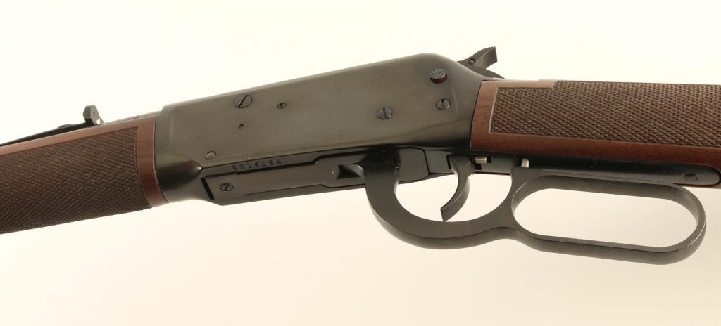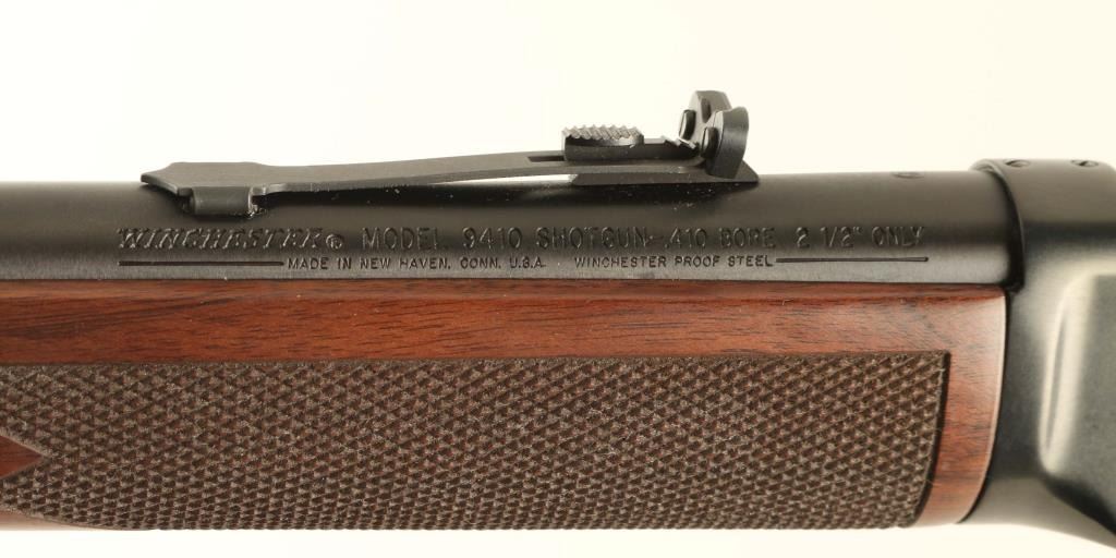 ‘Traditional’ Out of production lever action repeating shotgun chambered for 2 ½” .410 gauge shells, manufactured circa 2001-2006. Features a blued finish, cylinder choked 24" round barrel, full-length 9 round tube magazine, Tru-Glo green fiber-optic front sight, elevation adjustable semi-buckhorn rear sight, factory drilled & tapped receiver with ‘Angle Eject’ ejection port cut, smooth trigger with beveled edges, cross-bolt safety, grip safety, serrated hammer spur with extension installed, two barrel bands, satin finished walnut forend with point checkering and straight grip shoulder stock with factory rubber recoil pad & 13.5” LOP. Includes the original factory cardboard box with matching end label, documents and magazine plug. Shotgun retains approximately 99%+ of its original blued finish showing very little wear. Action is smooth, the bore is pristine and the wood stock are fine. Condition is near NRA Perfect in box. ***Modern Firearm***