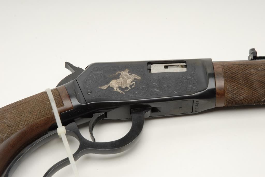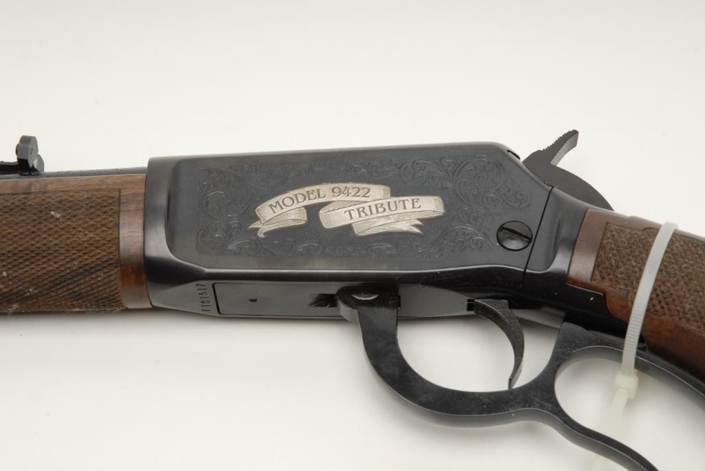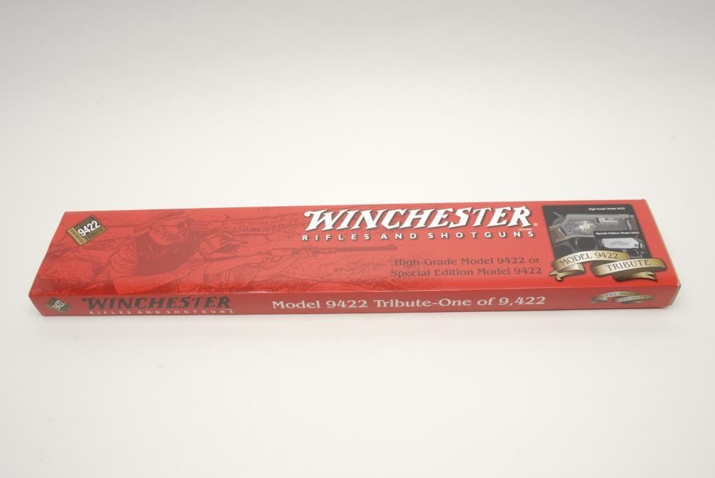 Winchester Model 9422 Legacy High Grade Tribute lever action rifle, .22 Long Rifle cal., serial #FTS1517. The rifle is in as new in the box condition showing only handling and little to no use. The rifle has a 22” blued, round barrel with a hooded front sight. The blued receiver is beautifully engraved with a silver inlay of the Winchester cowboy on horseback. The checkered wood stocks are as new with a smooth rubber butt plate. In the original factory box with sleeve,original Winchester shipping box and all associated packing material, accessories. This rifle was one of the last produced at the New Haven CT. plant that closed in 2006. Est.: $650-$1,300. (Modern).