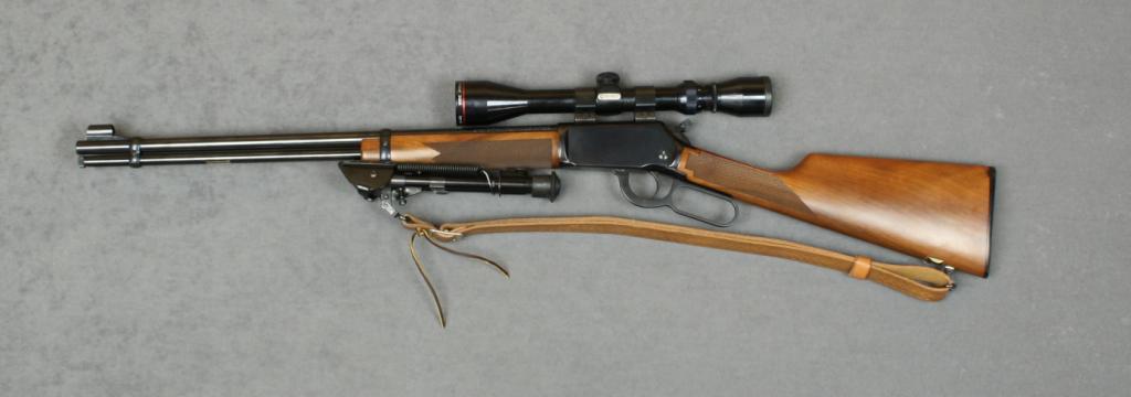 Winchester Model 9422 XTR lever action  carbine, .22 short, long or long rifle cal.,  20” barrel, black finish, checkered wood  stocks with folding adjustable bipod, leather  sling and mounted with a Simmons Wide Angle3X-9X40 scope, #F601655. This gun is in  overall excellent condition showing approx.  98% original finish, fine bore, action,  markings and wood stocks; scope has excellent  optics.  Est.:  $400-$600.