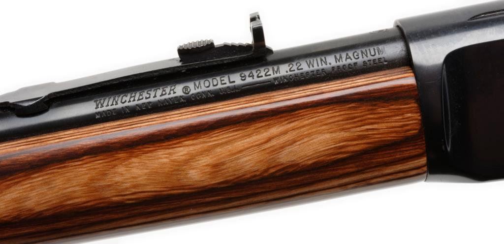 *Winchester Model 9422M lever action carbine, .22 Win. Mag. caliber, 20” round barrel, S/N F622244, blued finish, laminated wood stocks in fine condition showing little use; fine bore, action, markings and wood. Est.: $800-$1,200.