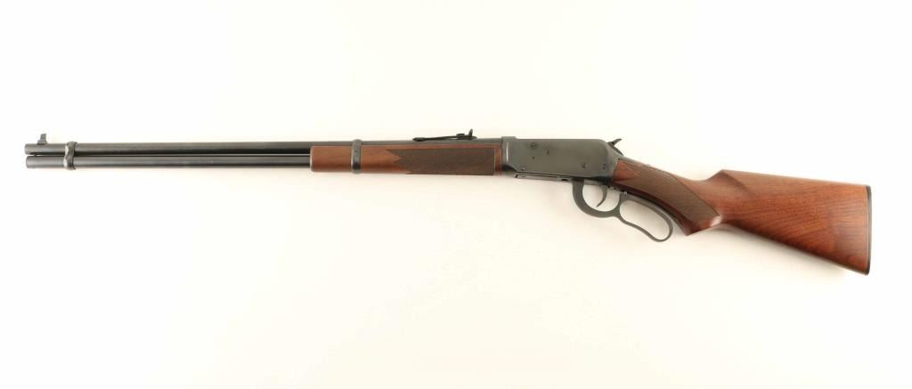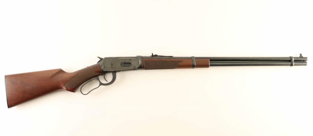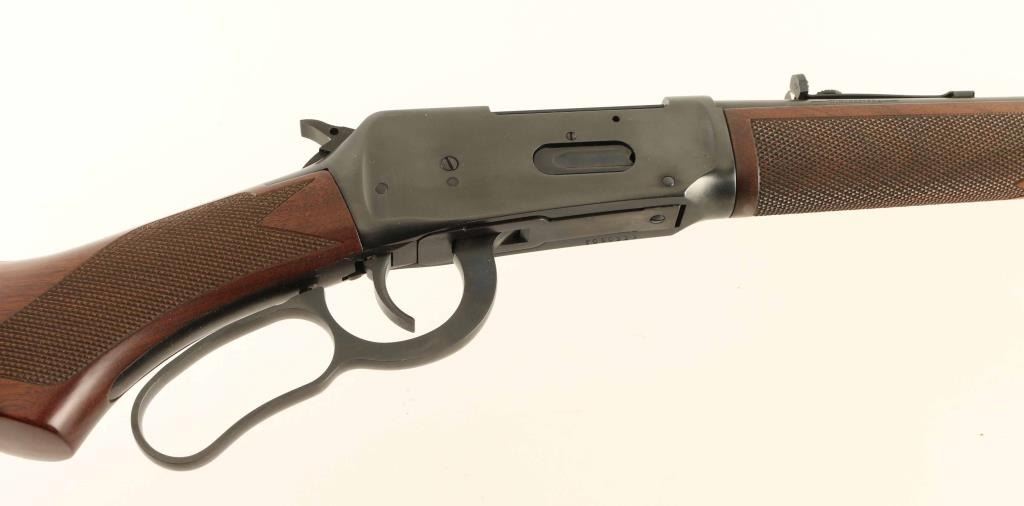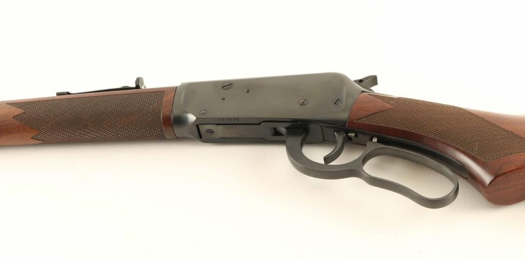 Lever action rifle chambered for 30-30 Winchester. Features an approx 24" barrel, iron sights with elevation slide, full length tube magazine under barrel, manual safety at tang, curved lever to match shape of stock. Walnut stock has a semi-pistol grip wrist with checkered panels, flat plastic buttplate. Matching forend has a large checkered area at rear that wraps around bottom and up both sides. Wood is oil finished and shows some nice grain pattern, especially at butt. Bore is very good, may clean to excellent. Retains 98% blue or better. Wood is in excellent condition with just a few small dents on sides of butt. Forend is a bit loose; band screw has slight damage to slot from ill-fitting screwdriver. Condition is NRA Excellent ***Modern Firearm***