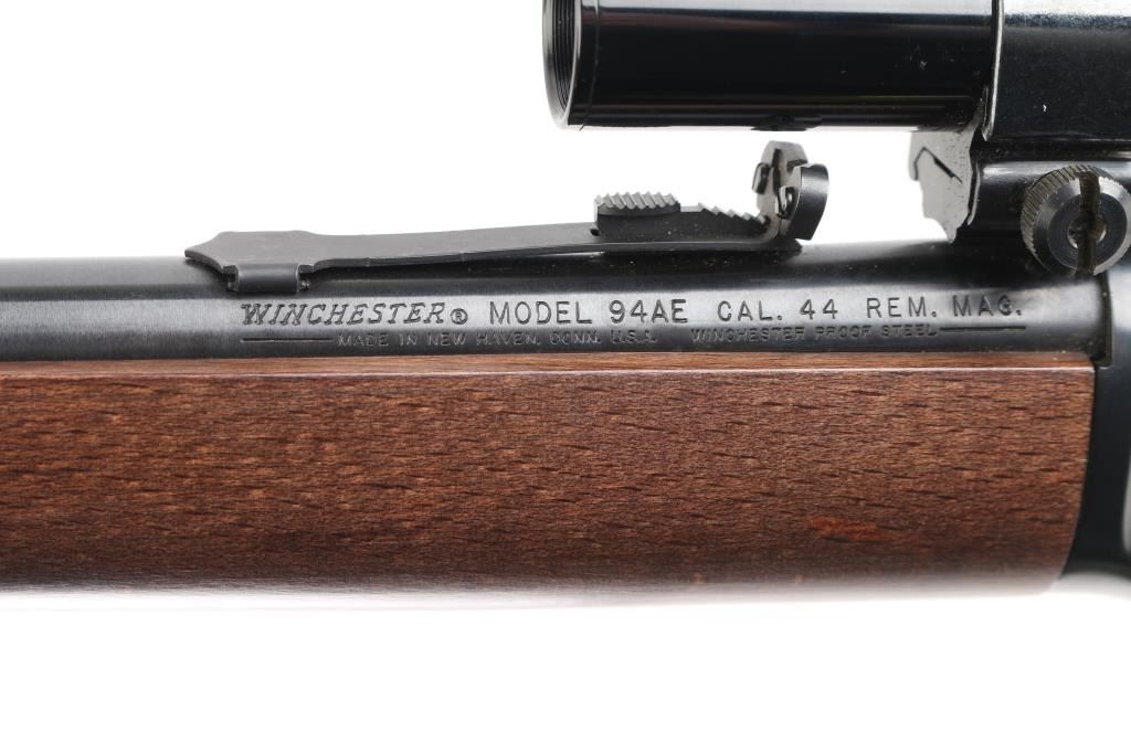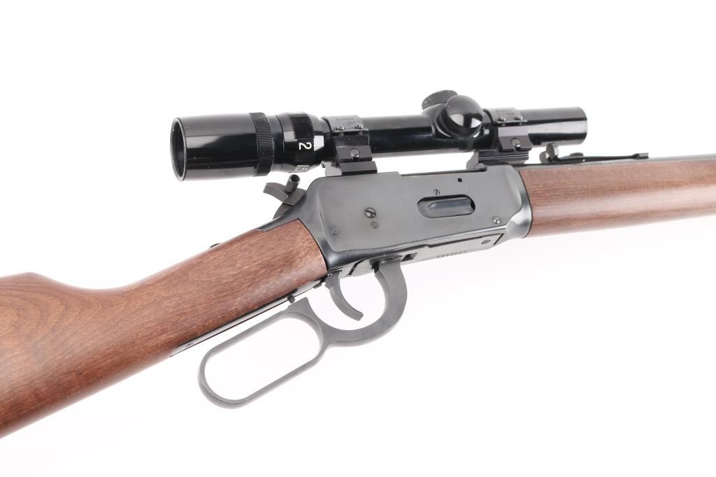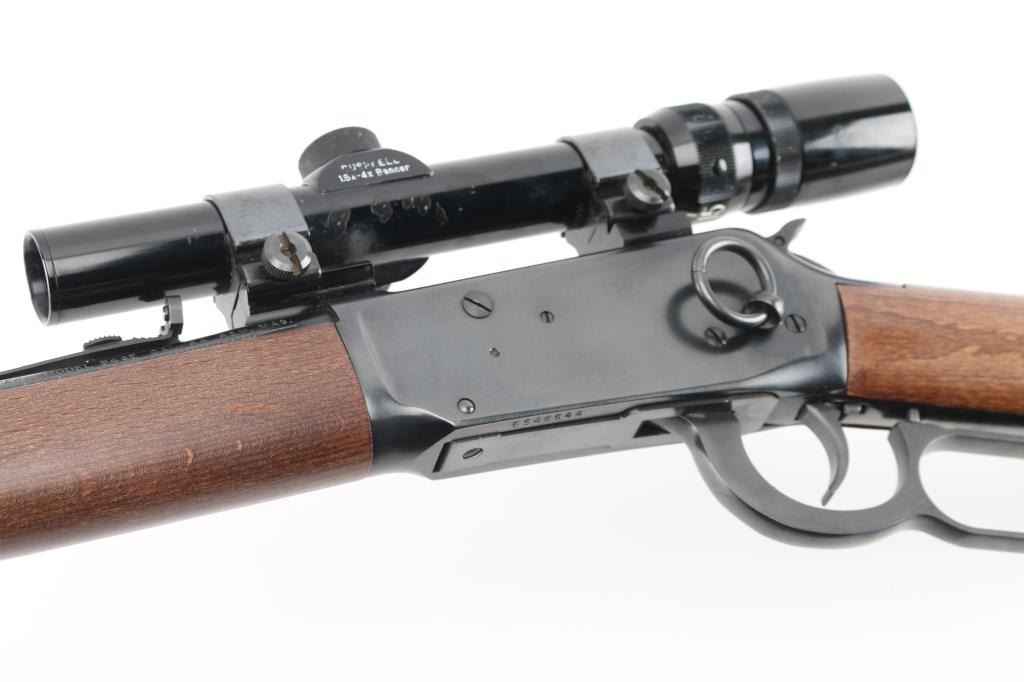 SN: 65465443. Lever action saddle ring carbine features blued finish, wood forend & straight gripped stock, factory plastic buttplate, 16" barrel, blade front sight, adjustable rear sight, full tube magazine under barrel, sliding tang safety. Saddle ring present, finger extension on hammer. Bore is excellent condition. Retains 99% blue. Wood is excellent condition. Condition is NRA Excellent. Modern Firearm.