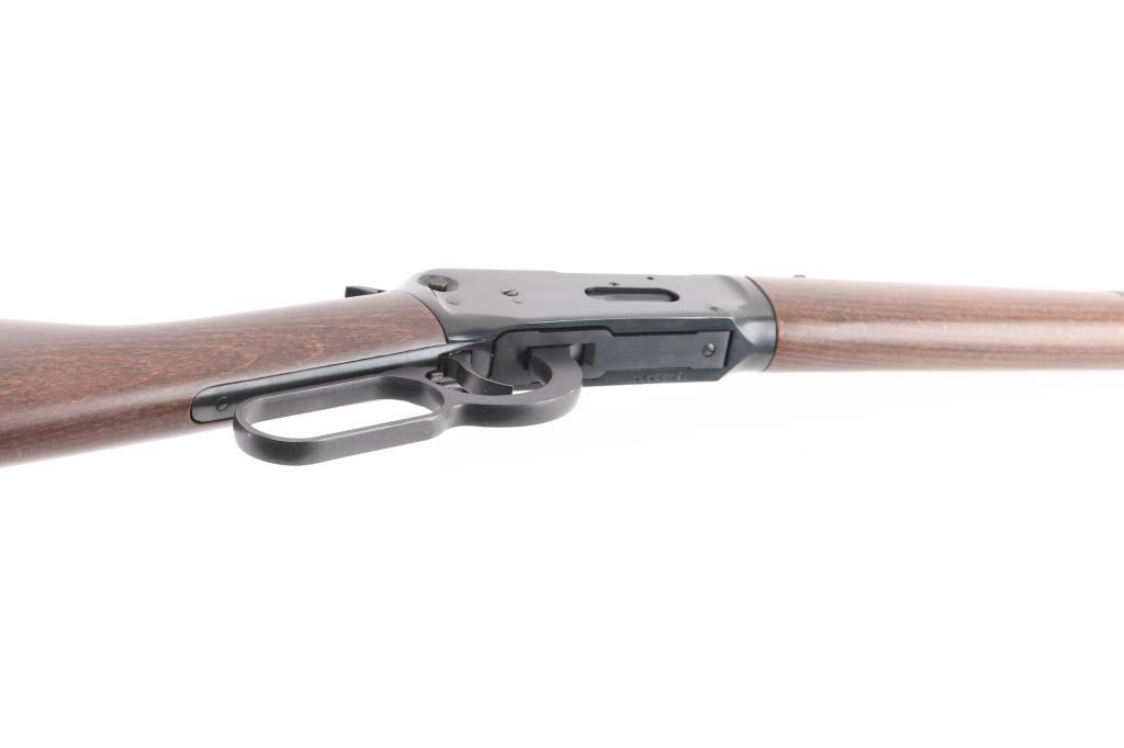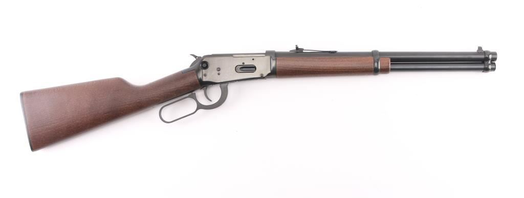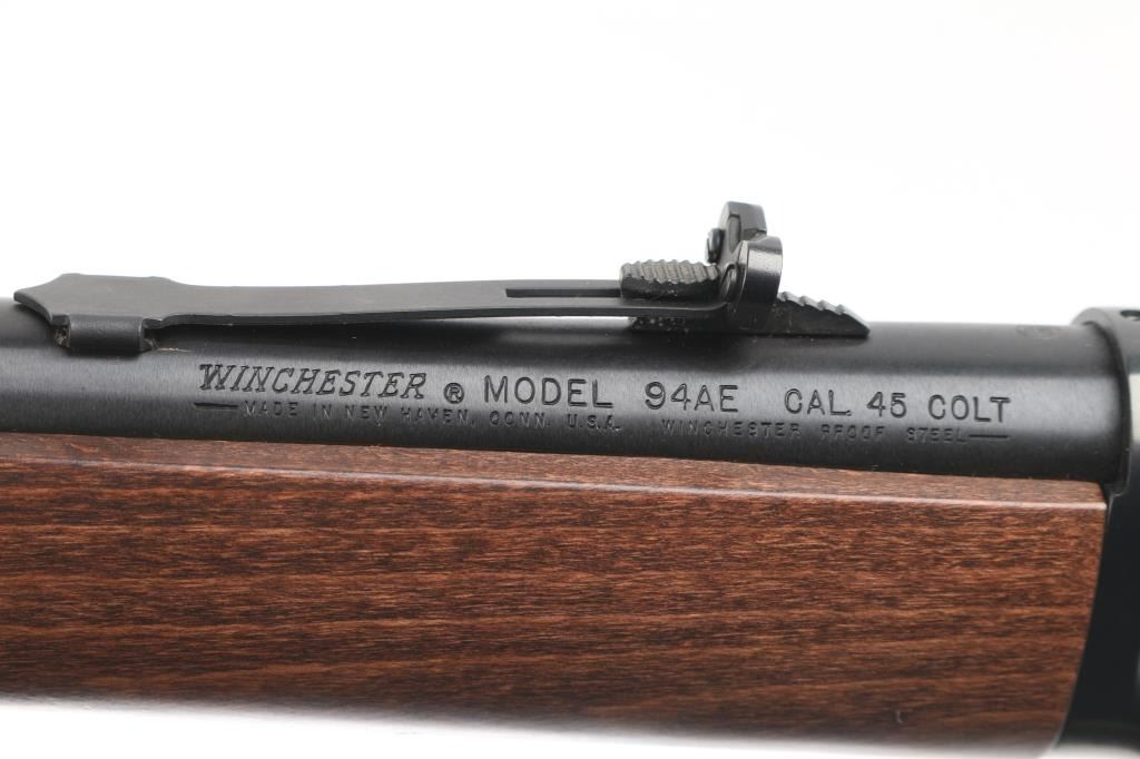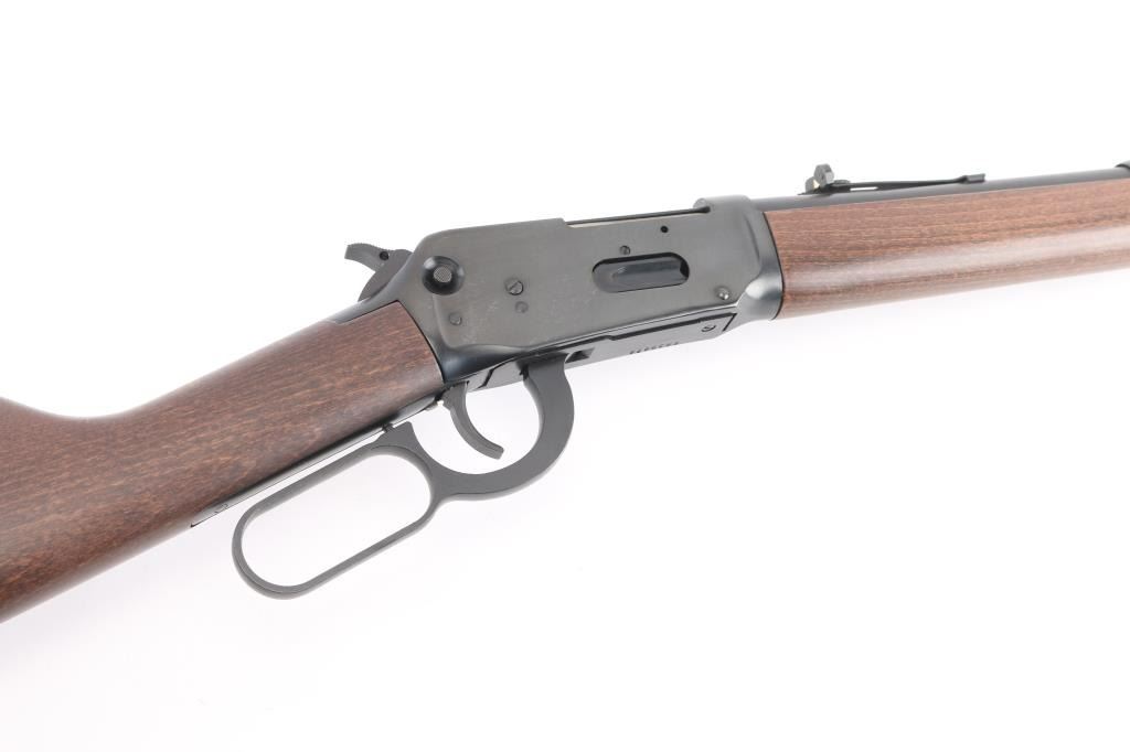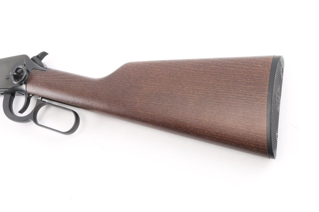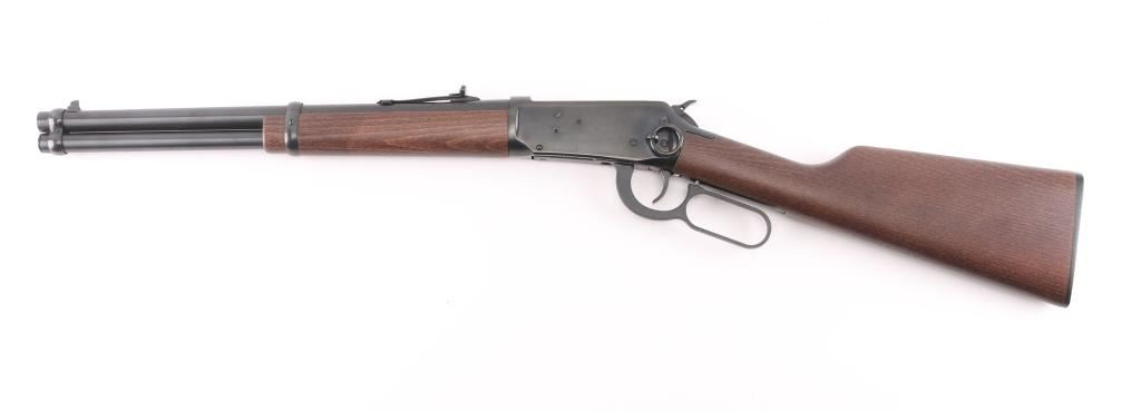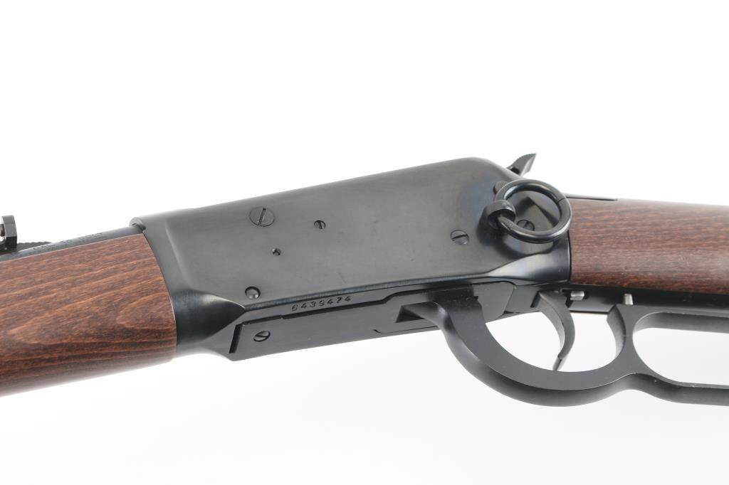 'Angle Eject' Lever action rifle features blued finish, smooth walnut forend & straight wrist stock, blued steel barrel bands, checkered black plastic factory buttplate, 18" barrel, blade front & sporting rear sights, full length magazine tube, manual cross bolt safety. Bore is excellent condition. Retains 98% finish with minor handling marks. Wood is excellent condition. Condition is NRA Excellent *** Modern Firearm ***
