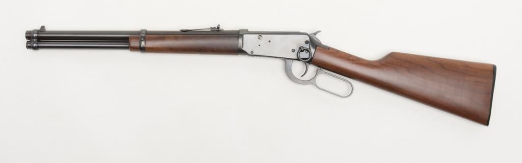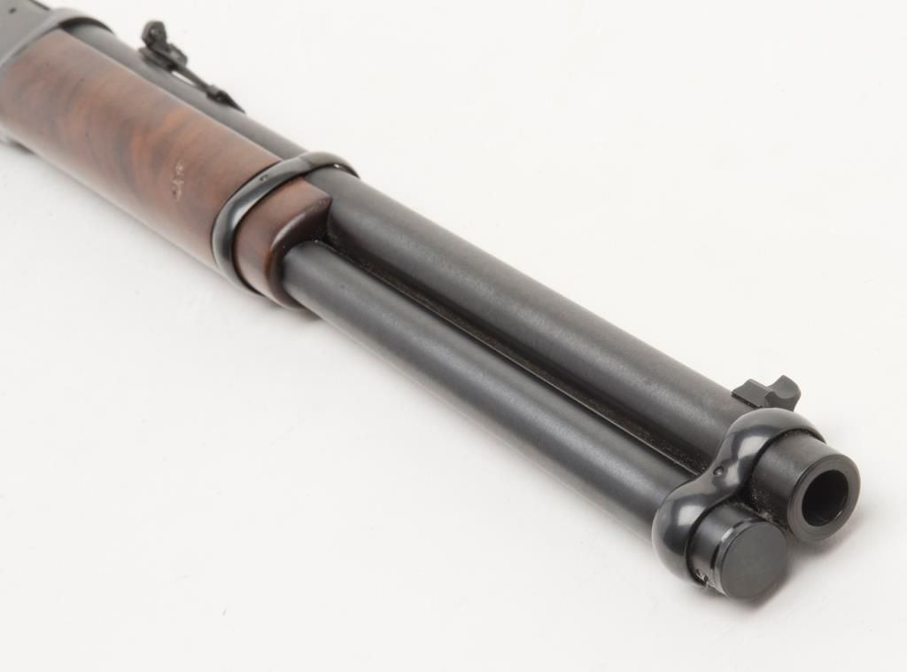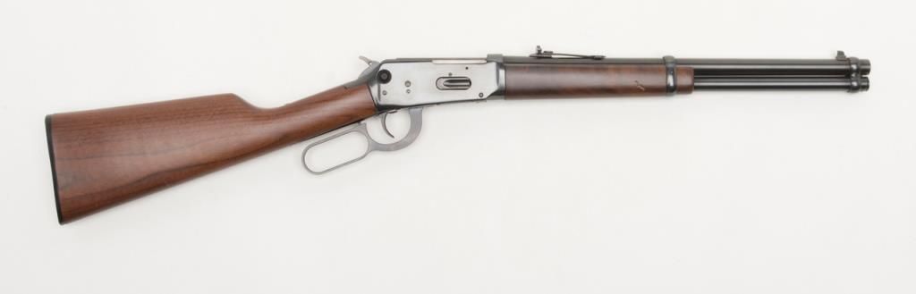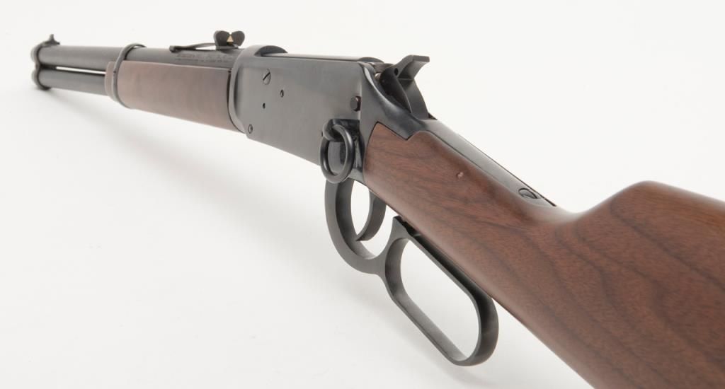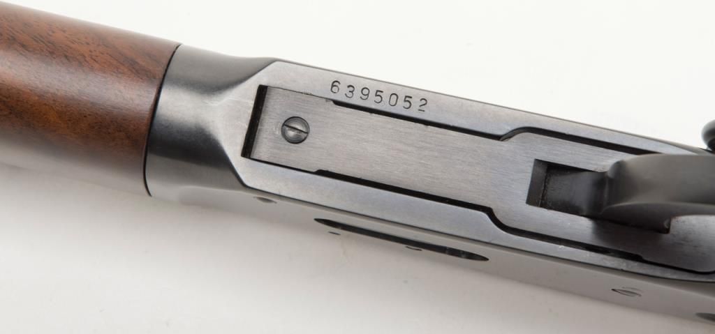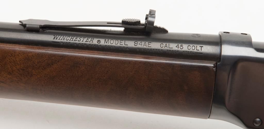 Winchester Model 94AE “Trapper” lever action SRC, .45 Colt cal., 16” barrel, blue finish, wood stocks, #6395052 in overall fine condition showing little use, 99%+ original finish, fine bore, action, markings; butt stock is fine, fore end has large ding on right side approx. 1” behind barrel band, otherwise also fine. (Modern). Est.: $400-$800.