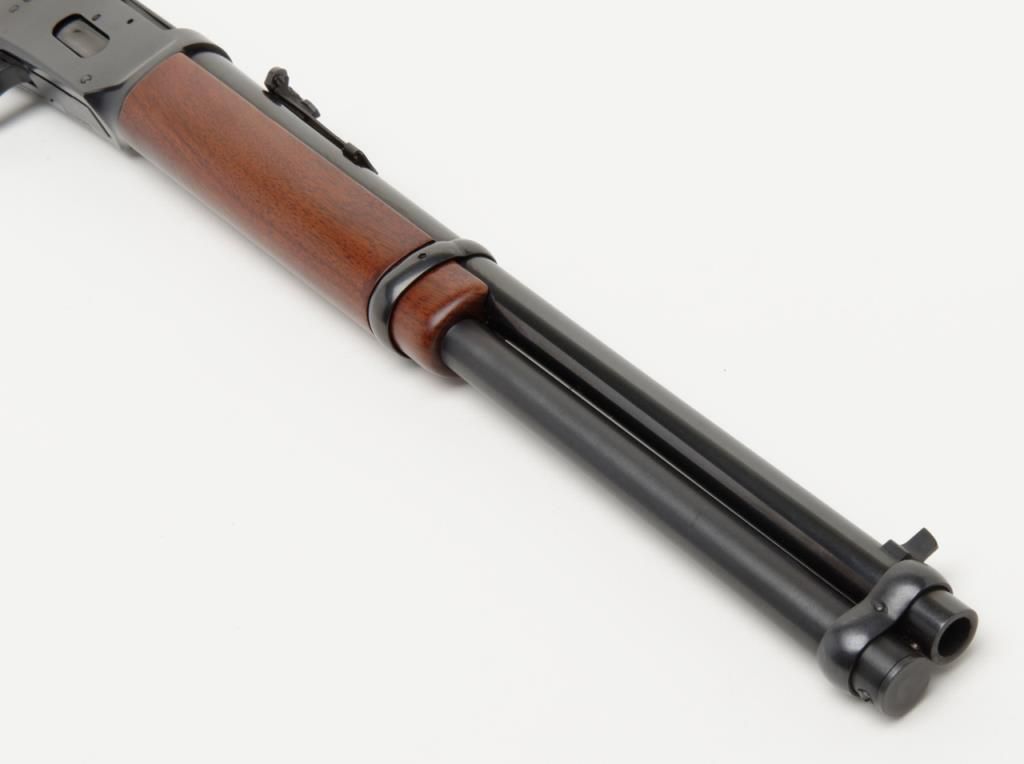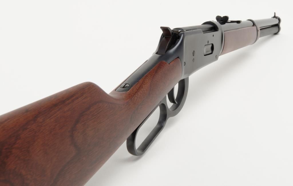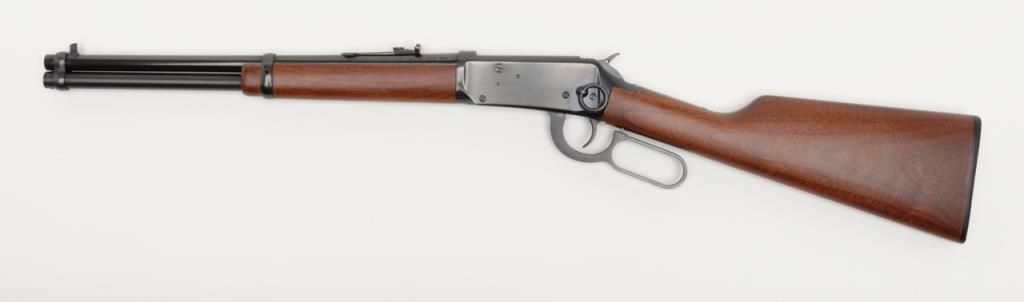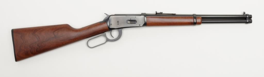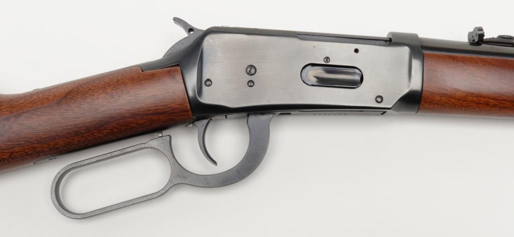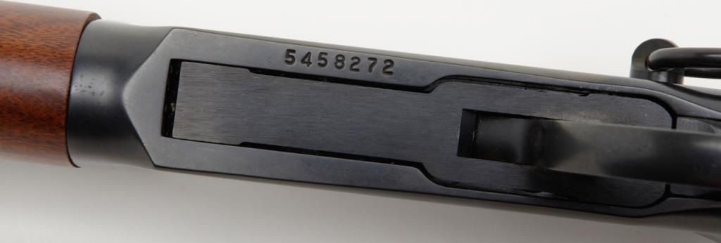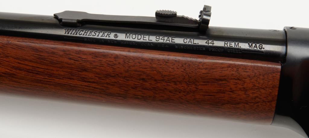 Winchester Model 94AE lever action SRC, .44 REM. MAG. cal., 16” Trapper’s barrel length, blue finish, wood stocks, #5458272 in like new condition showing little use or handling. (Modern). Est.: $600-$1,200.