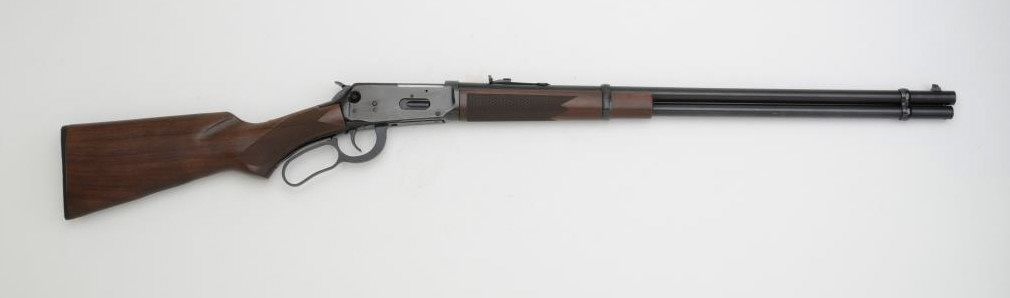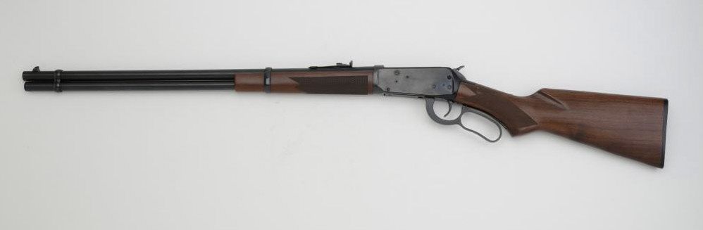 Winchester Model 94AE lever action rifle, .45 Colt cal., 24” round barrel, blue finish, checkered wood stocks, #6446361. This gun is in like new condition showing little handling. Est.: $300-$600.