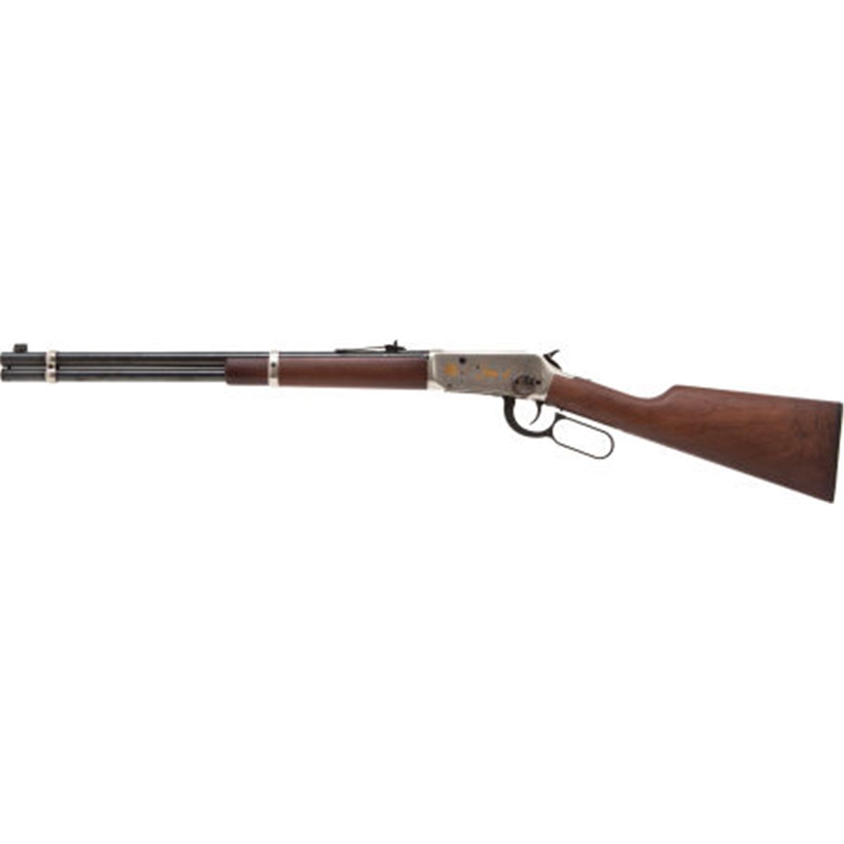 Winchester Model 94E NRA Commemorative Saddle Ring Carbine. Serial no. 06NRA0337, .44 Remington magnum caliber, 20-inch barrel with elongated bead front sight and elevation rear sight. Blued finish. Sides of stainless frame etched with floral scrolls, wildlife scenes and NRA logo, the latter in contrasting gold finish. Saddle ring. Satin-finished walnut stock and fore-end. Shotgun butt. Condition: Excellent to mint.NRA FIREARMS FOR FREEDOM PROGRAM