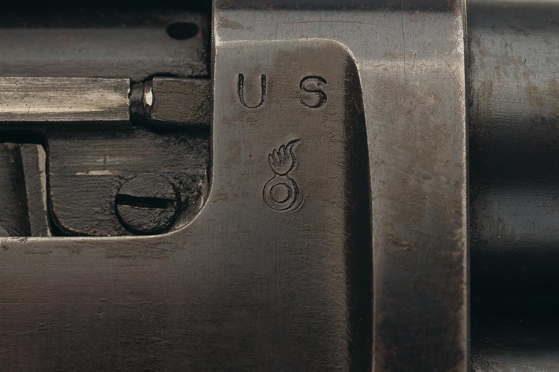 Single bead sight on the bayonet lug, 4-hole heat shield with the barrel marked for cylinder choke and a 2 3/4 inch chamber. Flaming bomb proof is present on the left side of the frame below a "US". Ribbed forearm and a smooth pistol grip stock with a checkered buttplate and a 13 3/4 inch length of pull. With a British proofed Winchester bayonet, 21 3/4 inches overall with a 17 inch blade, ribbed hardwood grips, and a leather sheath with "JEWELL/1917" on the belt hanger.