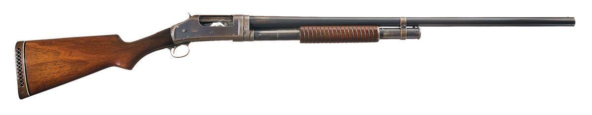 Made in 1936. Standard markings, single bead sight and full choke. Smooth pistol grip stock with vented Pachmayr White Line recoil pad and grooved slide handle. Length of pull 13 5/8".