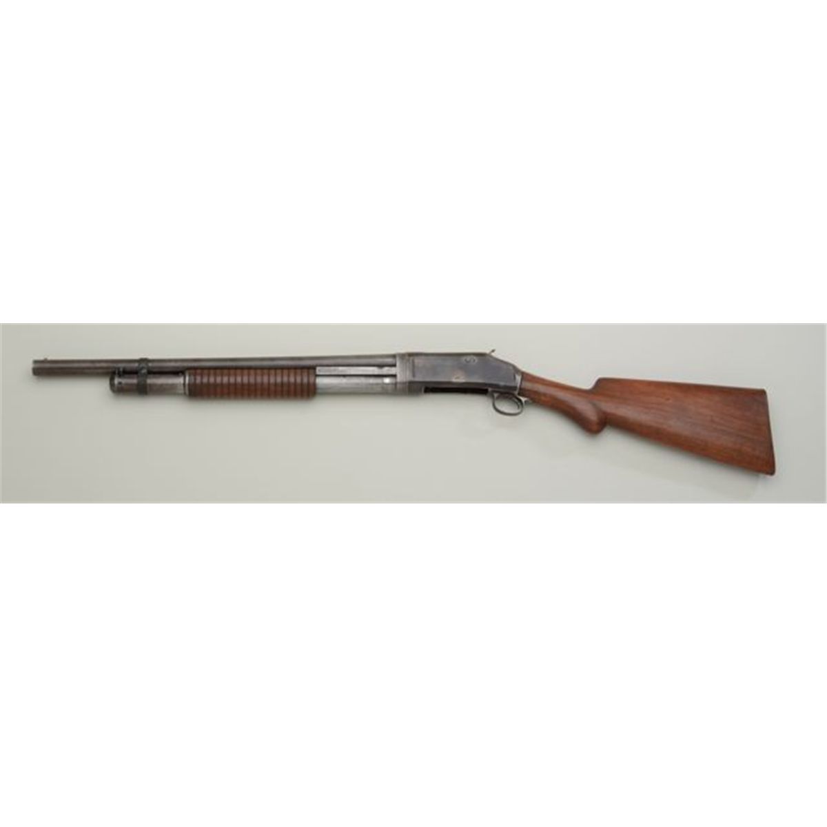 Winchester Model 97 pump action shotgun, take down variation, 12 gauge, barrel reduced to 20”, wood stocks, #C201952. This gun is in overall good condition showing a brown patina on the barrel and receiver with scatteredareas of erosion, good bore, action and markings; front end of the gun is numbered 793887; wood stocks are overall good with repairs to the front wrist area of the butt stock. Great for the End-of-Trails events.Est.: $150-$300.