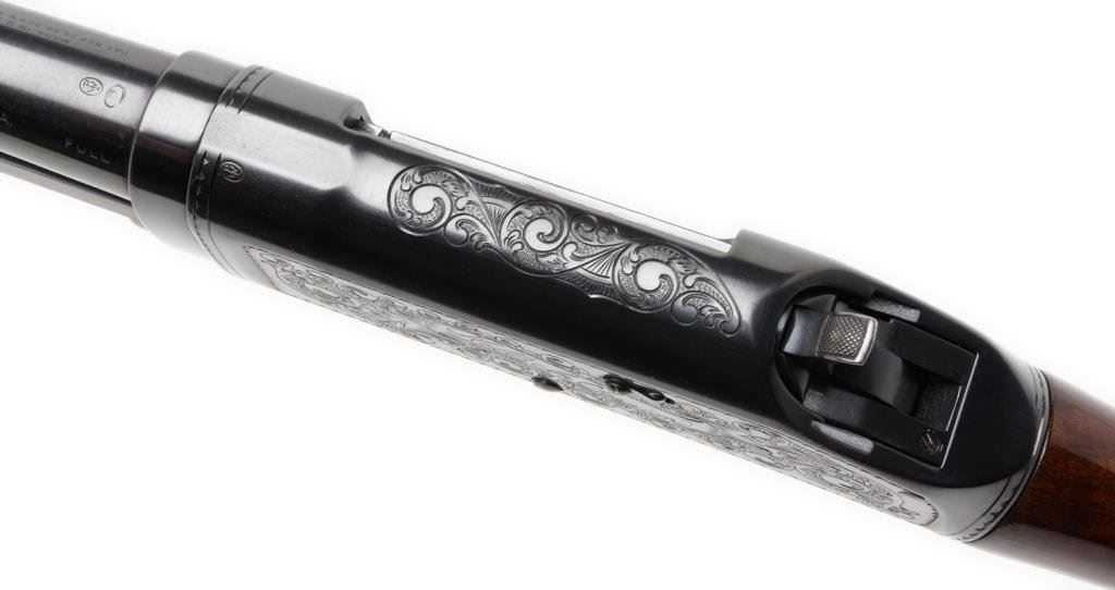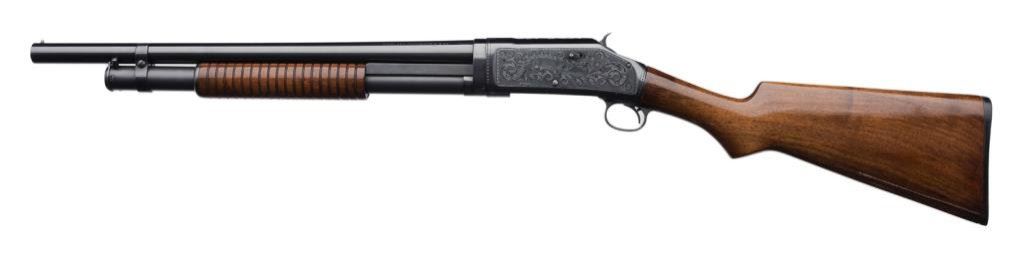 **Winchester Model 97 pump action takedown shotgun, custom engraved by noted firearms artist Jim Downing, 12 gauge, full choke, 19.5” barrel, S/N E 849521, custom blued finish, wood stocks, checkered Winchester hard rubber butt plate. This gun is in overall fine condition showing the majority of its custom finish, engraving includes a ribbon panel on the left side of the receiver marked “Hell’s in Session”; fine bore, crisp action that per consignor has been honed, polished, fitted and tuned; sharp markings and fine wood as refinished. Great for the re-enactor! Accompanied by 3 color photos and Certificate from Downing. Est.: $1,000-$3,000.