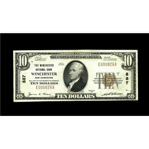 <B>Winchester, NH</B></I> - $10 1929 Ty. 1 <B>The Winchester NB</B></I> Ch. # 887<BR>The census includes just six of this type and denomination from here. This <B>Extremely Fine</B></I> is the nicest of that exclusive group and will likely see bidding reach at least...