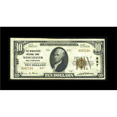 <B>Winchester, NH</B></I> - $10 1929 Ty. 2 <B>The Winchester NB</B></I> Ch. # 887<BR>This southern New Hampshire hamlet had only one National Bank, which served the town from 1865, the near beginnings of the National Banking System, all the way through the end. A respectable number of both large and small size notes are known to the collecting community, but this note is different. More than 7,000 Type 2 notes were issued and somehow, this is the only known survivor, and previously unrecorded in the census. Moreover, it is an attractive <B>Very Fine</B></I> with original embossing still present.