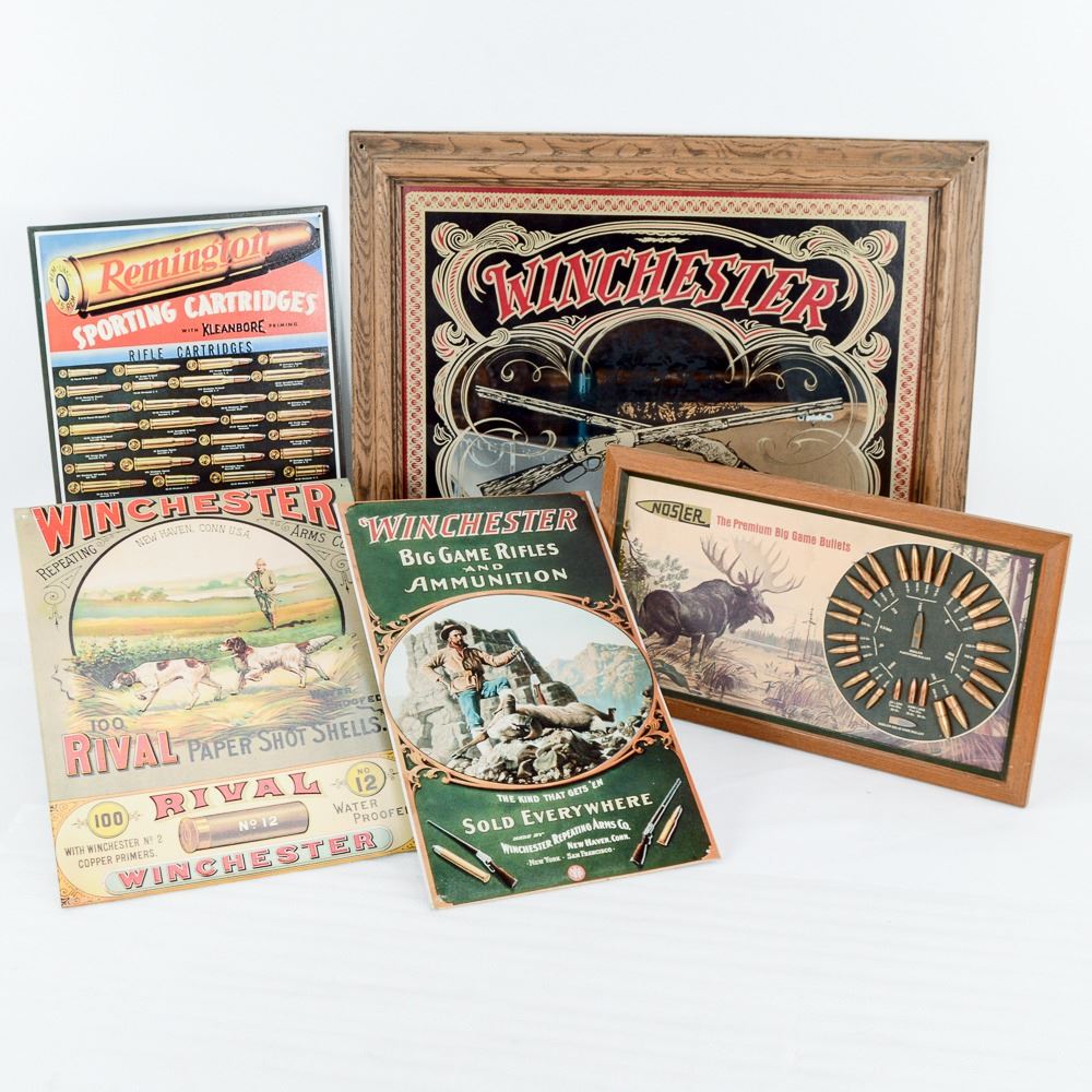 Includes a Nosler bullet board, 2 Winchester and a Remington metal signs, and a Winchester framed mirror. the frame measures 23 1/2"W X19 1/2"H. There are holes drilled and a notch cut out of the frame. See photos.