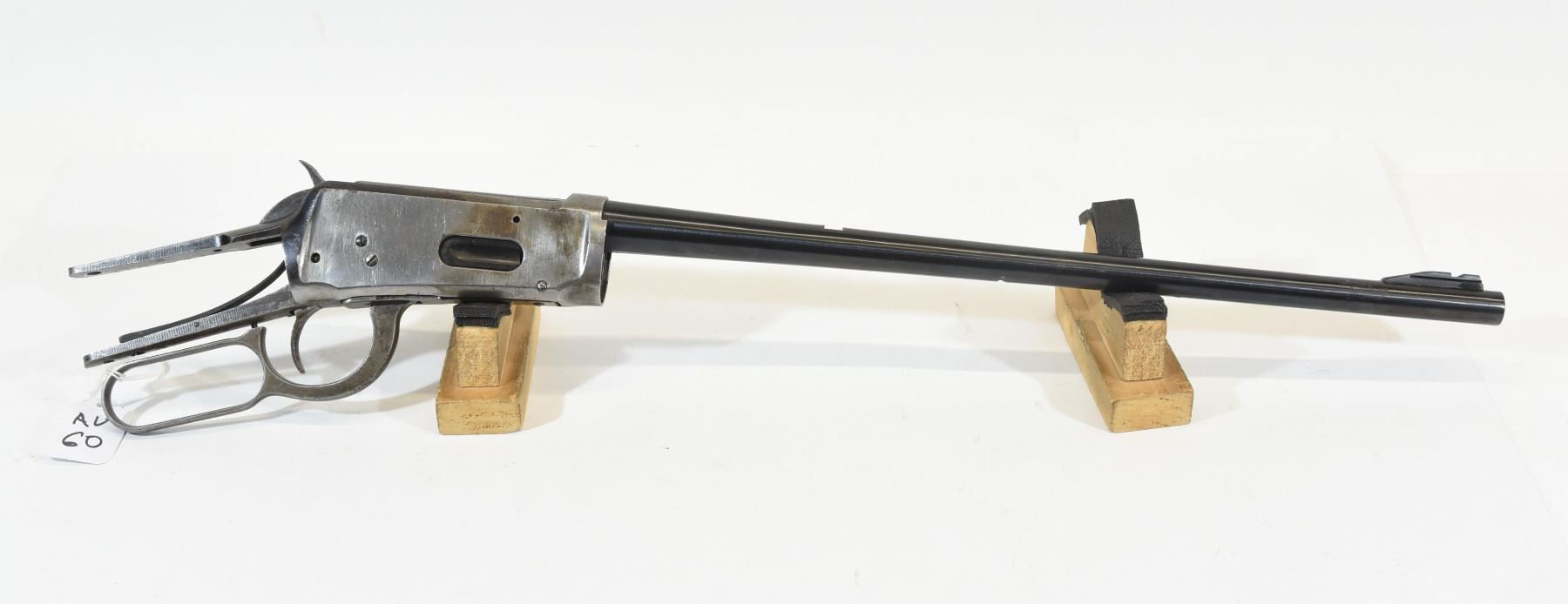 Action has trigger, lever, hammer, no bluing, SN 468240. The barrel is a post 64 30-30, 16" Trapper barrel, bluing is fair, bore is excellent, missing rear sight and part of the front sight and hood.