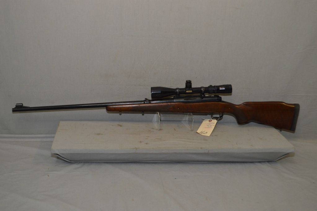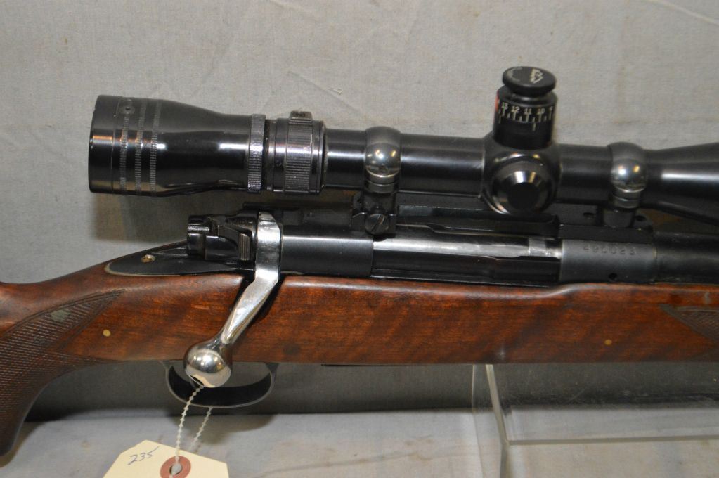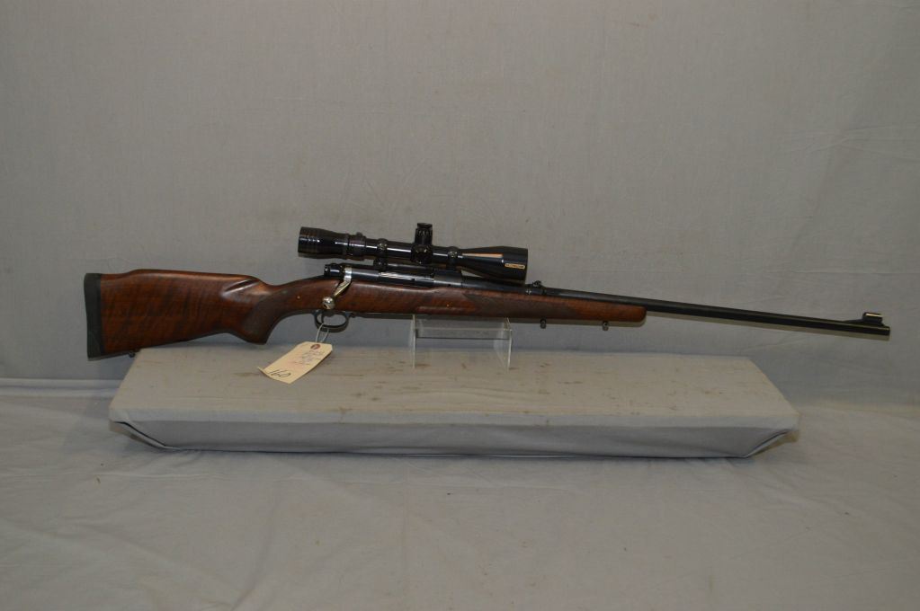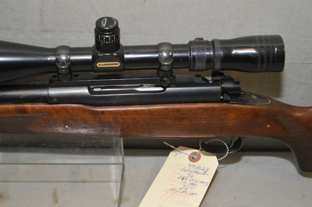 Winchester Pre 64 Model 70 .264 Win Mag Cal Bolt Action Rifle w/ 26" bbl [ patchy reblued finish, mostly on barrel, barrel sights with hooded front sight, also fitted w/ Redfield Illuminator 3 x 9 variable scope in Redfield rings & base, pistol grip stock & forend appears professionally repaired thru middle section, with pins, Decelerator recoil pad, Circa 1960 ] Ser # 490023