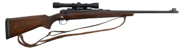 * With leather sling and flip over 4X Redfield scope (allowing the open signs to be used without removing the scope!). Manuf. 1954.