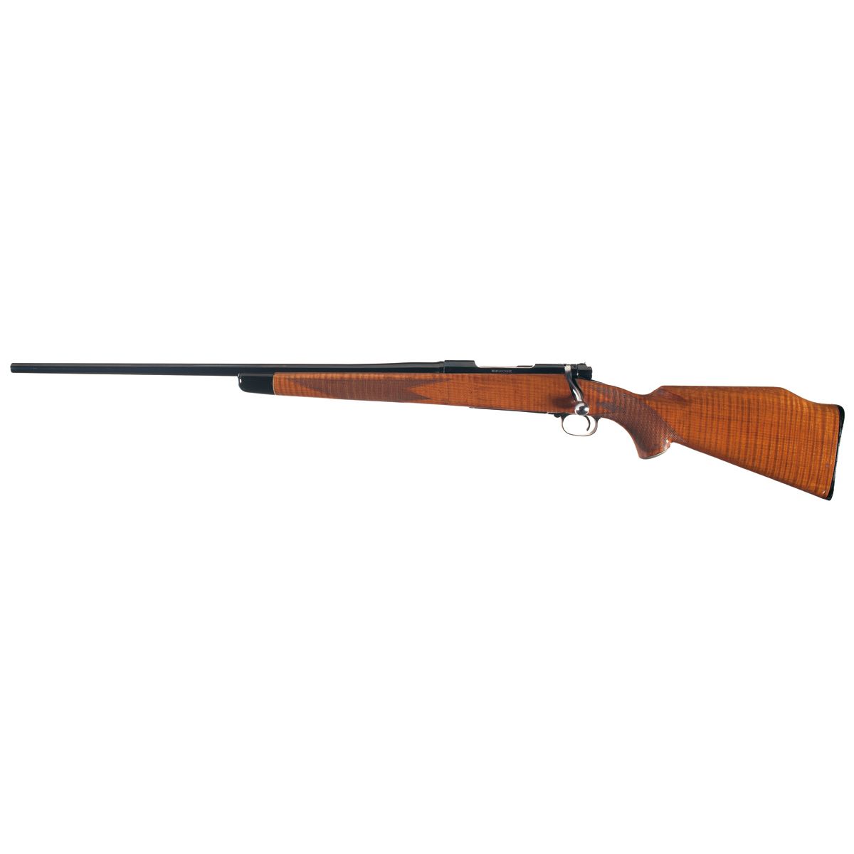 Made in 1953. Custom barreled with a converted left handed bolt, checkered tiger stripe stock. From the Collection of Colonel Charles Askins.