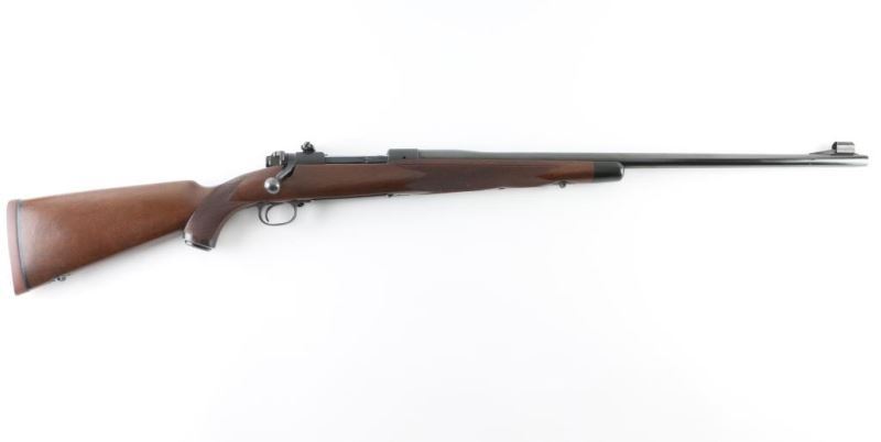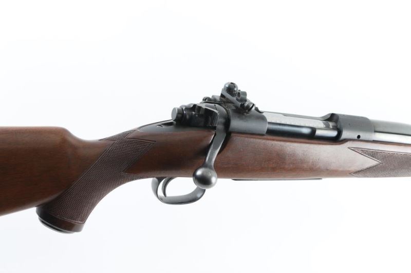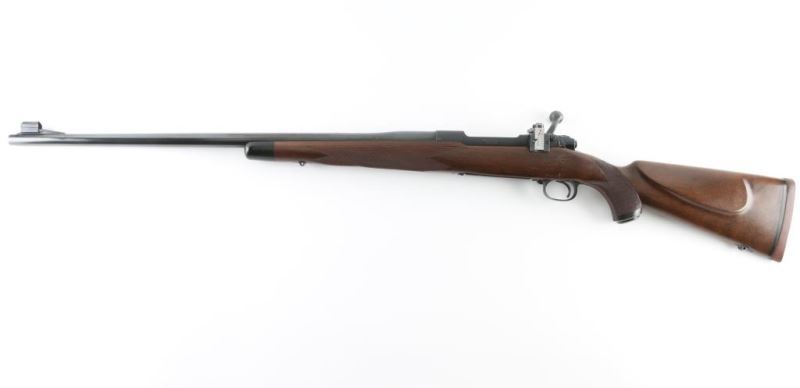 H& H Mag SN: 168956 Bolt action rifle manufactured circa 1950. Features blued finish, wood stock with semi-pistol grip, solid rubber recoil pad, checkered panels at wrist & forend, right hand cheek piece, ebony forend tip, 25.5" barrel, hooded blade front sight, barrel drilled & tapped for rear sight, receiver ring drilled & tapped on top (no matching holes on top of bridge), bridge drilled & tapped on side with installed Lyman receiver rear peep sight, three position safety, hinged floorplate, European style inlet sling studs. Bore is very good condition. Retains 95% bluing with handling marks. Wood is very good condition with scratches and dents. Marked "SUPER GRADE" on floorplate.
