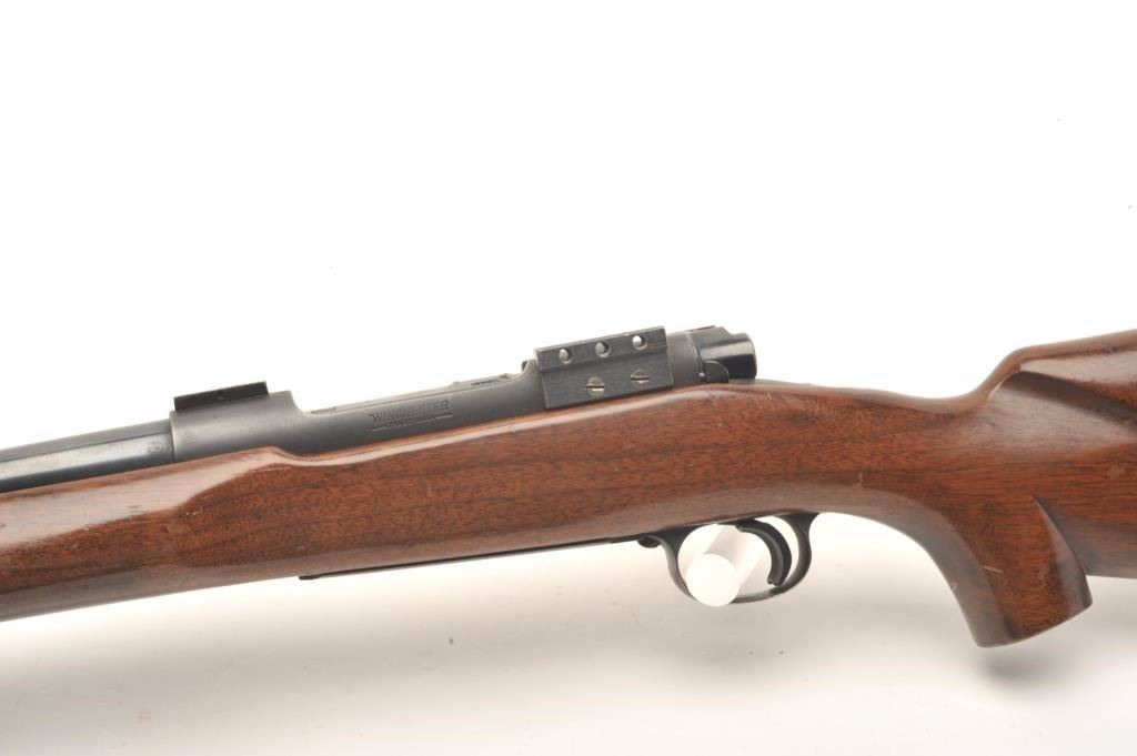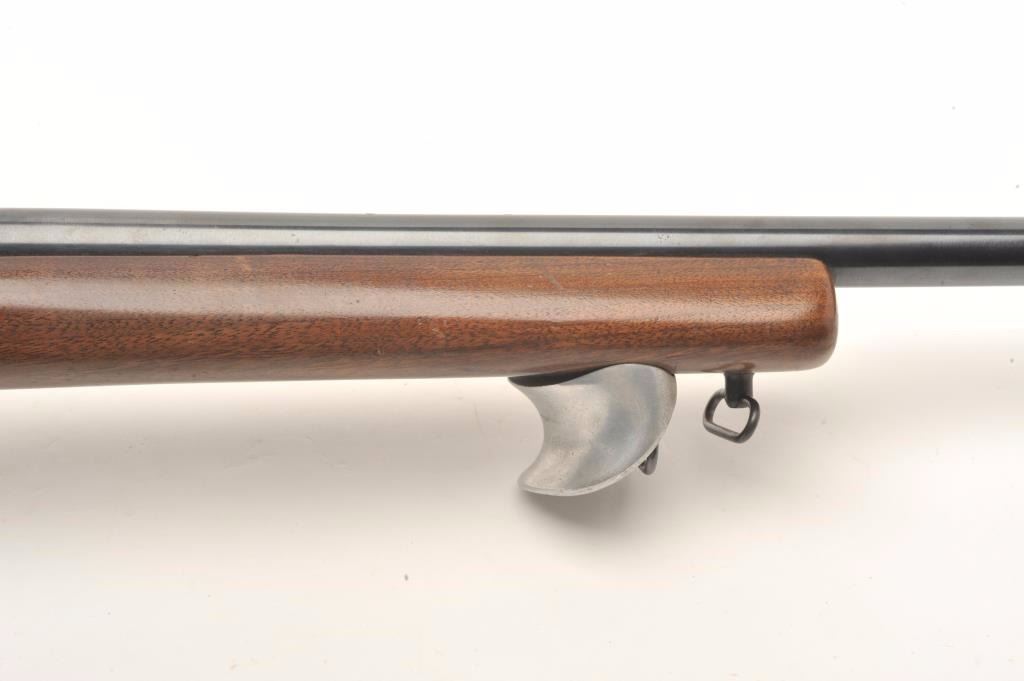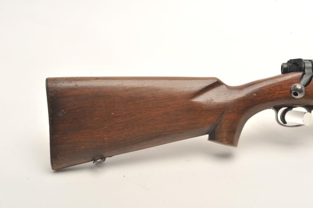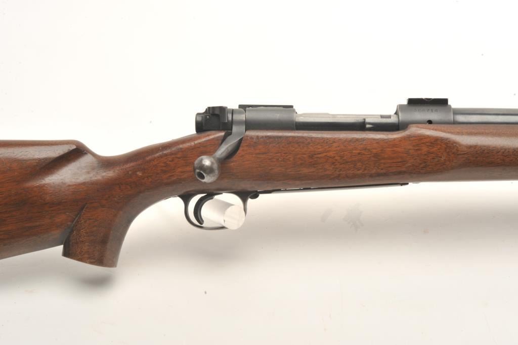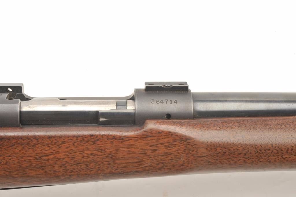 Winchester Pre-64 Model 70 bolt action target rifle, 30/06 caliber, serial #364714. The rifle is in good overall condition with a 24” bull barrel with the front and rear sight removed. The barrel and receiver retainthe majority of their blued finish with a side mount for a peep sight and trigger shoe added. The checkered wood target stock is in good condition showing moderate use with an oversize fore end with aluminum target mount. The butt stock includes sling swivels and ends with a checkered steel butt plate. The bore is fair, the action crisp and markings are sharp. (C+R) Est.: $600-$1,200.