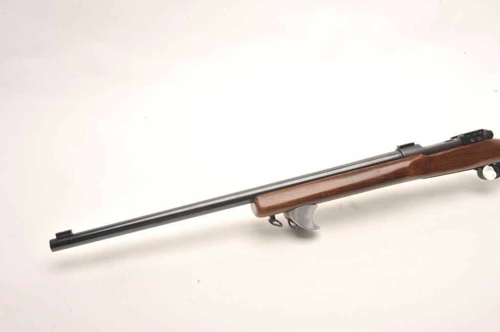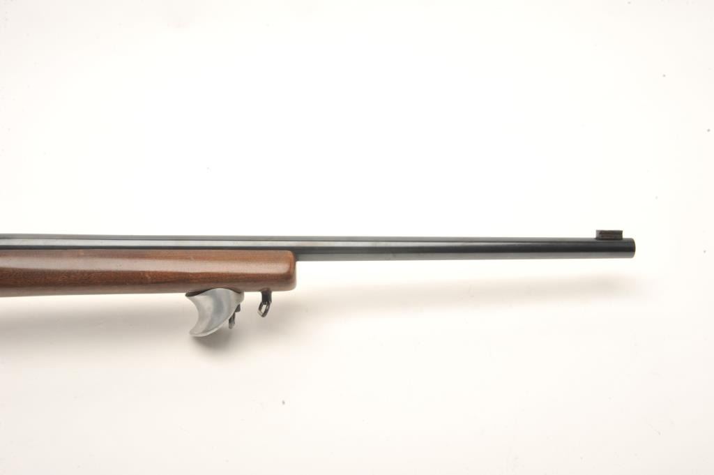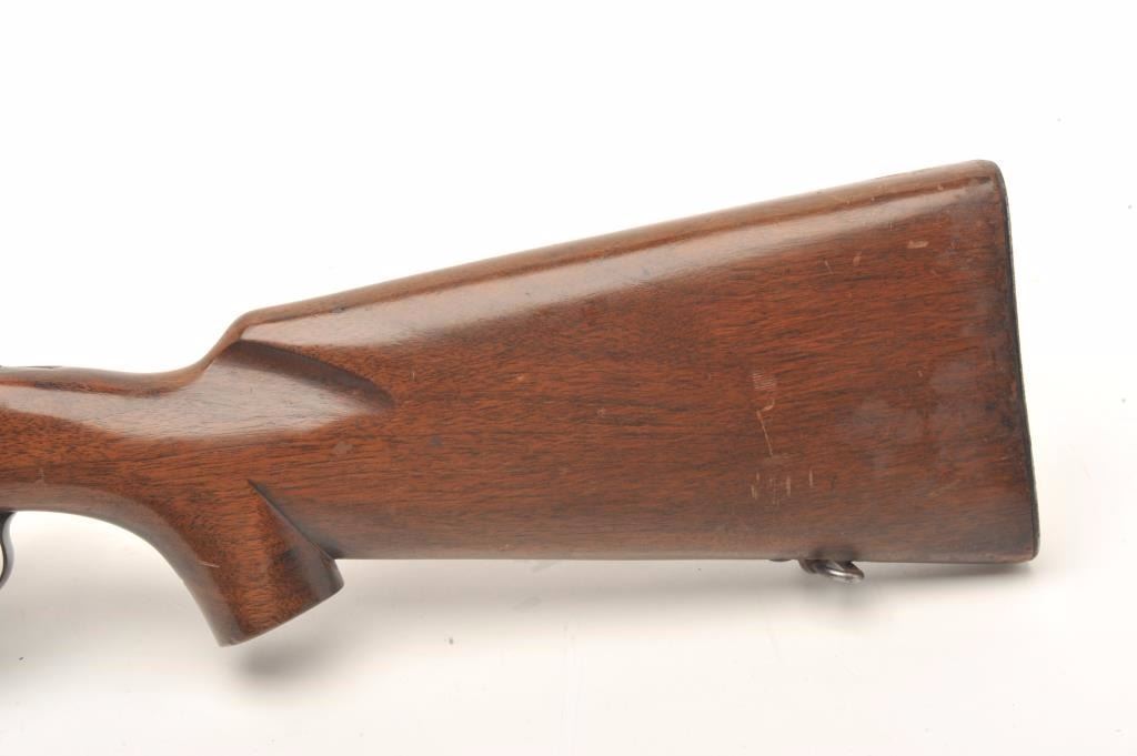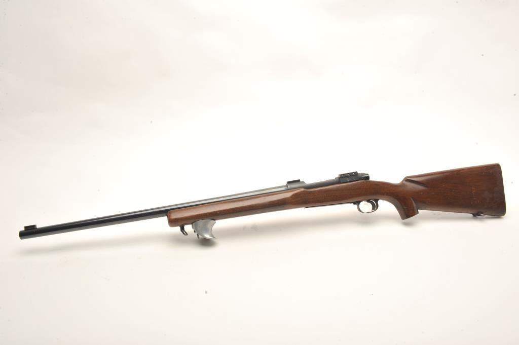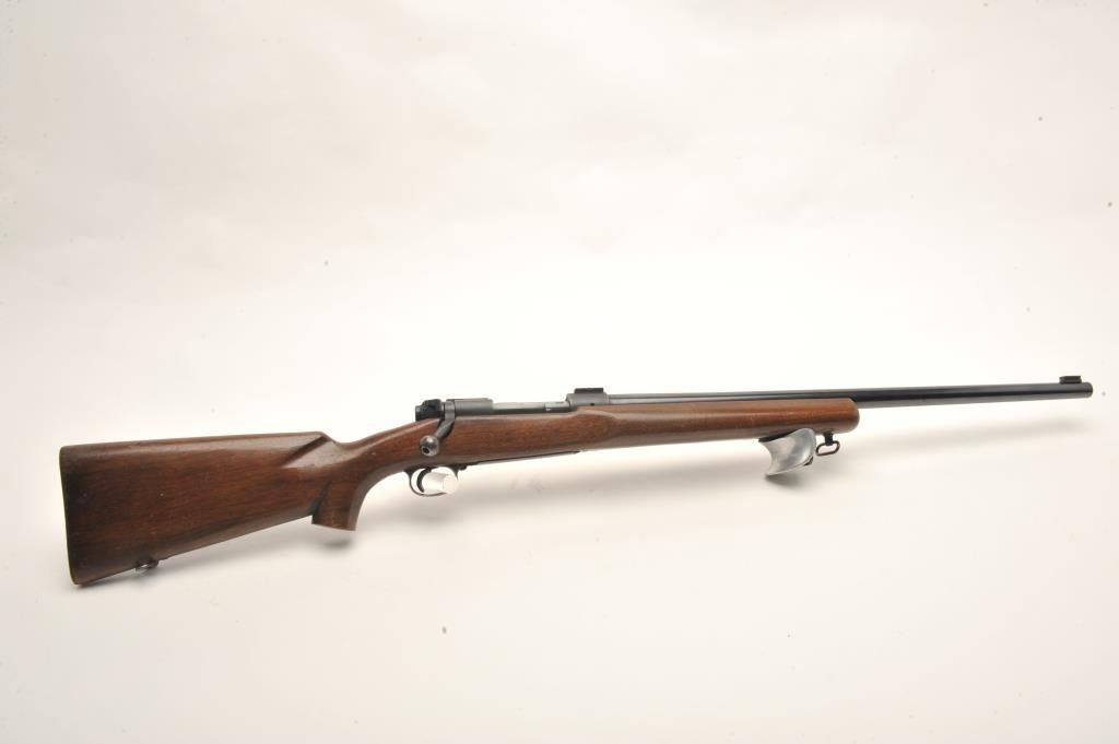 Winchester Pre-64 Model 70 bolt action target rifle, 30/06 caliber, serial #364714. The rifle is in good overall condition with a 24” bull barrel with the front and rear sight removed. The barrel and receiver retainthe majority of their blued finish with a side mount for a peep sight and trigger shoe added. The checkered wood target stock is in good condition showing moderate use with an oversize fore end with aluminum target mount. The butt stock includes sling swivels and ends with a checkered steel butt plate. The bore is fair, the action crisp and markings are sharp. (C+R) Est.: $600-$1,200.