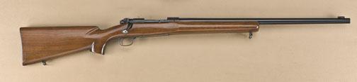 Winchester Pre-64 model 70 factory heavy barrel, .257 Roberts caliber, 24” barrel, target type stock, serial #83359. The rifle remains in very good plus original condition, showing 90-95% thinning at magazine andedges of barrel. Two extra tap holes in barrel which are filled by screws for scope. There is a plus in the front barrel dovetail. The stock shows a light coating of varnish but no sanding with a few minor scratches and mars. Adjustable forward sling position, milled steel buttplate. Good action, fine bore. There is an indentation in the stock and slight marks on the receiver from side-mounted receiver sight. A scarceheavy-barrel model 70 in this caliber. Est: $700 - $1,400