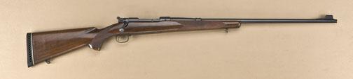 Winchester Pre-64 model 70 rifle, .300 magnum caliber, serial #38723. In very good plus original condition showing 85-95% original blue, thinning on the edges. Rear sight removed, front sight cover present. Factorytype sling swivels, hard-rubber buttplate added. Stocks lightly freshened with some minor scratches and minor mars. Action crisp, bore excellent. Est: $900 - $1,800