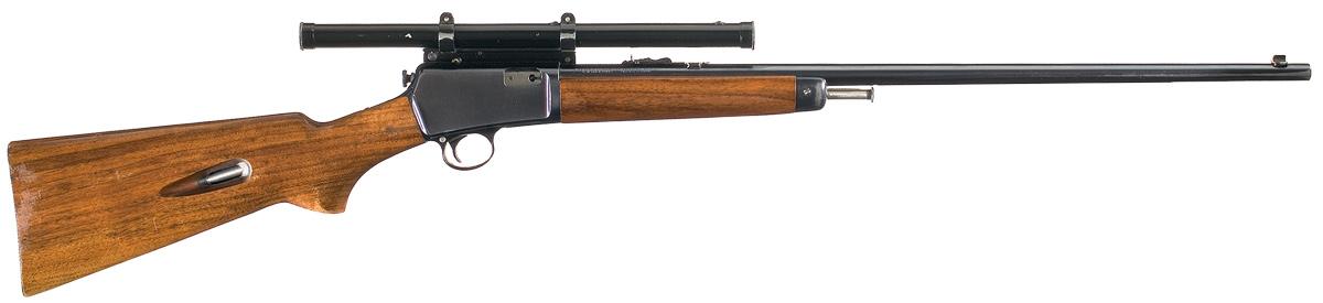Produced in 1939. Dovetail bead front and adjustable sporting rear sights, with standard markings on the barrel. Takedown receiver, with a Lyman 422 Expert long tube scope mounted in an adjustable Lyman base, secured to the left side. Smooth pistol grip stock, with metal forearm tip, large loading port, and smooth metal buttplate with magazine access.