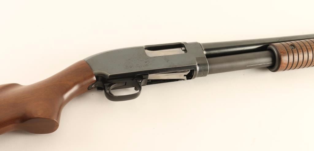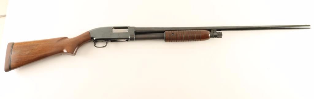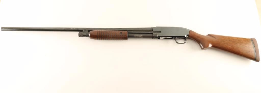 Vintage light weight slide action repeating shotgun chambered for 2 3/4" 12 gauge shells, circa 1961. Features a blued finish, 30" full choke barrel, 1/2 length magazine tube, silver bead front sight, smooth trigger, push button safety, grooved walnut slide handle and pistol grip shoulder stock with Kick-Eez recoil pad. Shotgun exhibits approximately 90% of it's original blued finish showing slide wear on the moving parts, scattered handling marks, edge wear and a patch of oxidation on the right side of the receiver. Action is smooth, bore is excellent and wood stocks are very good with a 2" hairline crack on the top right side of the forend. Condition is very good. ***C&R Firearm*** ***Modern Firearm***
