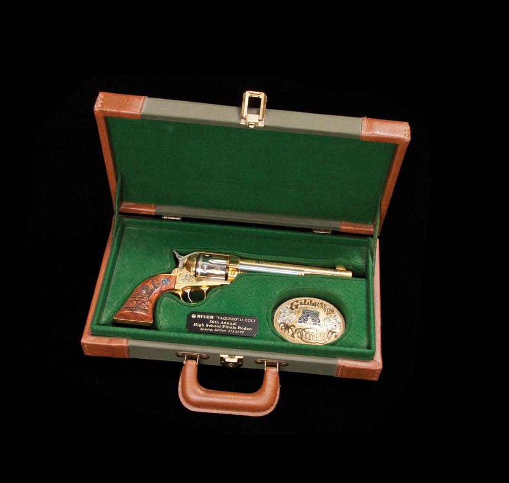 a) Ruger Vaquero (copy of the Colt Single Action) in .45 Colt and 7 1/2” barrel. Laser engraved with gold tone finish and silver accents. Trigger and hammer have jeweled finish. Cased with Crumrine Trophy belt buckle in high relief, 4 1/2” x 3 1/2” oval;