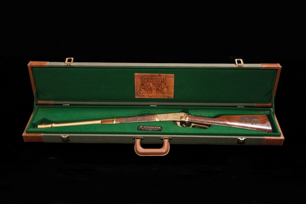 b) Winchester Model 1894E Saddle Ring Carbine in matching .45 Colt caliber, with matching finish and case. Stock is a fancy grade with deep carving. Side of the frame has facing rearing horses.