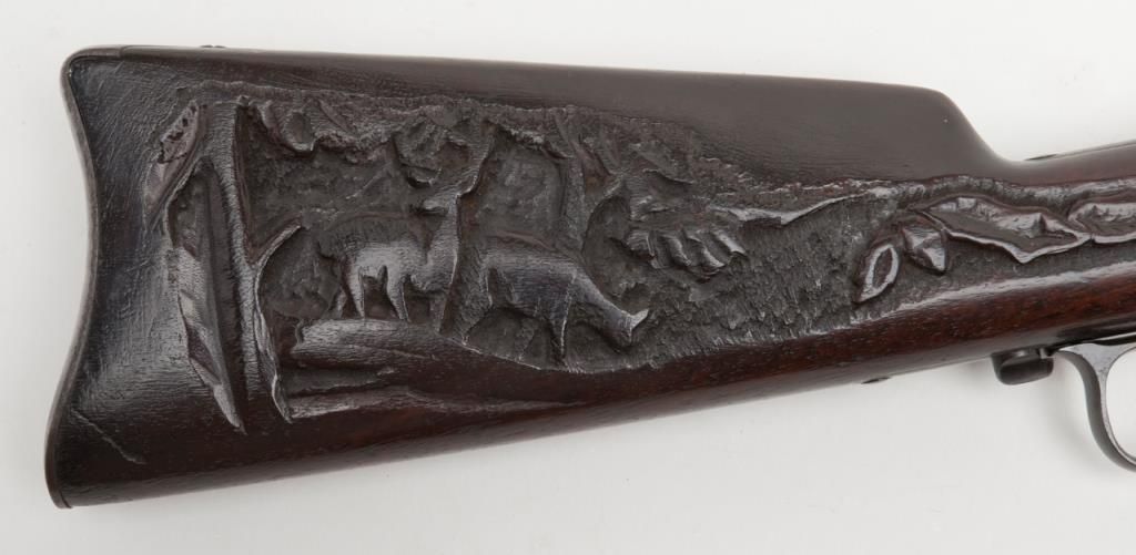 Winchester Second Model 1876 SRC, .45-60 cal., 22” round barrel, traces of original blue finish, folk art carved stock, #28227. The right side of the action is professionally engraved during the period of use in fancy letters that appear to be“R. G.” and the right side of the butt stock shows carving of a stag and doe in the forest while the left side of the butt stock shows a jumping stag. Metal surfaces display 20%-40% blue drifting to a light brown patina; markings are good; loadinggate shows most of its original blue; the action is good, bore is good and the gun is generally good to very good overall with a pleasing, well-maintained appearance. (Antique). Est.: $3,500-$7,000.