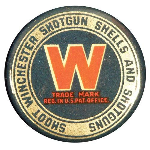 Celluloid Pinback advertising Winchester Shot Gun Shells and Shot Guns with Red W. Excellent condition. 1 inch diameter.