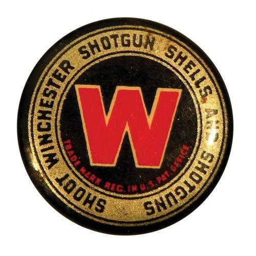 Celluloid Pinback advertising Winchester Shot Gun Shells and Shot Guns. 3/4 inch diameter.
