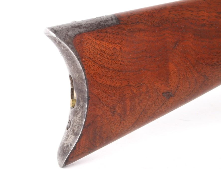 This is an exceedingly rare early Winchester 1876 2nd. Model octagon rifle in desirable .45-60 caliber with rarely seen special order casehardened/case colored receiver and Winchester Factory Letter. This rifle comes with a Winchester Repeating Arms Company factory letter issued by the Cody Firearms Museum which houses the original Winchester manufacturing and shipping records. This rifle with serial number 23237 is documented by the museum as being: rifle, .45-60 caliber, octagon barrel, plain trigger, Casehardened, received in the warehouse on April 19, 1882 and shipped from the warehouse with one other arm on April 20, 1882. The second model is easily identifiable by the dust cover rail on top of the receiver being connected to the receiver by two screws. Later rifles have this rail made integral with the receiver. The second model is eagerly sought by collectors as it was an early limited production run from approximately 1877 to 1882. After serial numbers passed approx. 25000 the third models began. Survival rates for these early frontier used Winchesters is very small compared to later versions which were made in larger numbers and saw years less usage. The standard finish on these big 28” octagon rifles was full blue on the barrel, magazine and receiver. Any deviation from this is considered very scarce. Casehardened receivers were rarely special ordered and examples today are seldom encountered. This is especially true for early 2nd Model 1876s. This nearly 140 year old example is in particularly fine condition inside and out. Case colors fade from receivers very rapidly with handling and even sunlight diminishing the colors. The receiver on #23237 retains good case colors around the rear of the side plate on the right side, light faded case color overall on the left side plate and behind the side plate on the frame, under the lever and in other small protected areas of the receiver. The loading gate also retains fine original nitre blue finish. The brass lifter on the bottom of the receiver has not been polished or buffed and retains a lovely mustard patina. It is clearly factory engraved “45-60.” The upper tang retains the deep stamping “MODEL 1876.” The barrel retains a soft lightly thinning blue with excellent markings consisting of caliber designation along with the standard Winchester address and patent dates. The barrel is also fitted with the rare and desirable sporting ladder rear sight with slide intact. The front sight is a Rocky Mountain blade. The magazine tube displays fine deep blue. As was the custom with Winchester, when a special order rifle was processed, a finer piece of walnut was often selected. This special order rifle with caseharden receiver was fitted with a butt stock displaying a nice “fiddleback” striped grain pattern. The butt stock appears to have been reinforced at the wrist with a small through and through dowel repair that was expertly done and is barely noticeable. The stock fits the receiver with no looseness or movement and is minor in all respects. The forend is excellent and the butt stock is fitted with the correct heavy crescent butt plate with brass sliding trap door for cleaning rods. The action works perfectly with only the lever spring somewhat loose. The lever catch is intact and the half cock notch on the hammer is strong. The bore is surprisingly fine with strong rifling and any roughness fairly minor. The Model 1876 was Winchester’s first truly big bore repeating rifle. Essentially, it was a limited production rifle produced as a much larger version of their popular and heavily produced smaller Model 1873 which was chambered for the “revolver length” cartridges .44-40, .38-40 and .32-20. The Model 1876 was designed for big game hunting primarily in the western part of the country where game much larger than eastern deer and black bear were commonly found. It is interesting to note that Theodore Roosevelt was a big fan of the Model 1876 and used several throughout the West that he had special ordered from Winchester. The Model 1876 was a serious specialized rifle that was made in limited quantities. This rifle with 28” barrel is chambered in the powerful and popular caliber .45-60. This cartridge held a .45 caliber lead bullet weighing 300 grains in front of a full charge of 60 grains of black powder. This was a very potent cartridge that was used successfully on elk, grizzly bears and even buffalo, which were hunted in Montana as late as 1883. Most surviving 1876 rifles show very heavy frontier use and often abuse making this fine special ordered example a rarity because of its fine condition as well as special ordered casehardened receiver. Very few Winchester or Old West collections contain a 2nd. Model 1876 .45 caliber octagon rifle with fancier than standard wood and case colored receiver. This is an Antique Firearm and does NOT require an FFL.