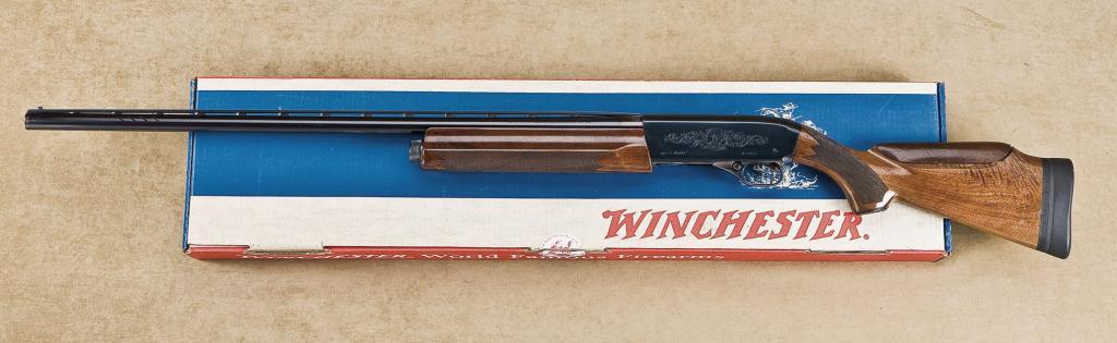 Winchester Super-X Model 1, 12ga, semi-automatic trap shotgun, with adjustable Monte Carlo type cheek piece, and thick recoil pad added. 30” ventilated barrels ported for recoil reduction. Very good plus to near fine condition in original box. Serial M31081. These Super-X shotguns have been discontinued for over 25 years, and this particular example has won many trap competitions. 92 – 95% original blue. Some use and small losses and slight damage to wood. Est.:$600 - $1200