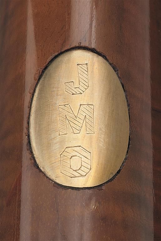 As confirmed by the copy of a letter from Eugene F. Williams, Jr., this shotgun was once the personal property of the late John M. Olin. The shotgun features dual bead sights, 2 3/4 inch chamber, choked skeet, and jeweled bolt and follower. The receiver sides feature a floral scroll pattern. The special high grade walnut straight grip stock features checkering, a leather covered recoil pad and a "JMO" initial oval for John M. Olin on the underside. Note that standard Super X shotguns had a pistol grip stock. Length of pull is 13 3/4 inches.