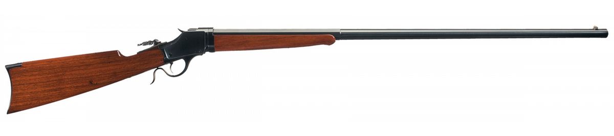 Manufactured in 1919, features a #3 round barrel with a dove tailed blade front sight with rear sight removed and Marble folding rear peep sight. The top of the barrel is marked with the standard two line Winchester address/patent dates followed by "33 W.C.F." The top of the receiver at the breech is marked with the Winchester oval proof with the serial number is marked on the lower tang. All blue finish and mounted with a smooth Schnabel forearm with ebony insert and straight grip stock with blue crescent steel buttplate.