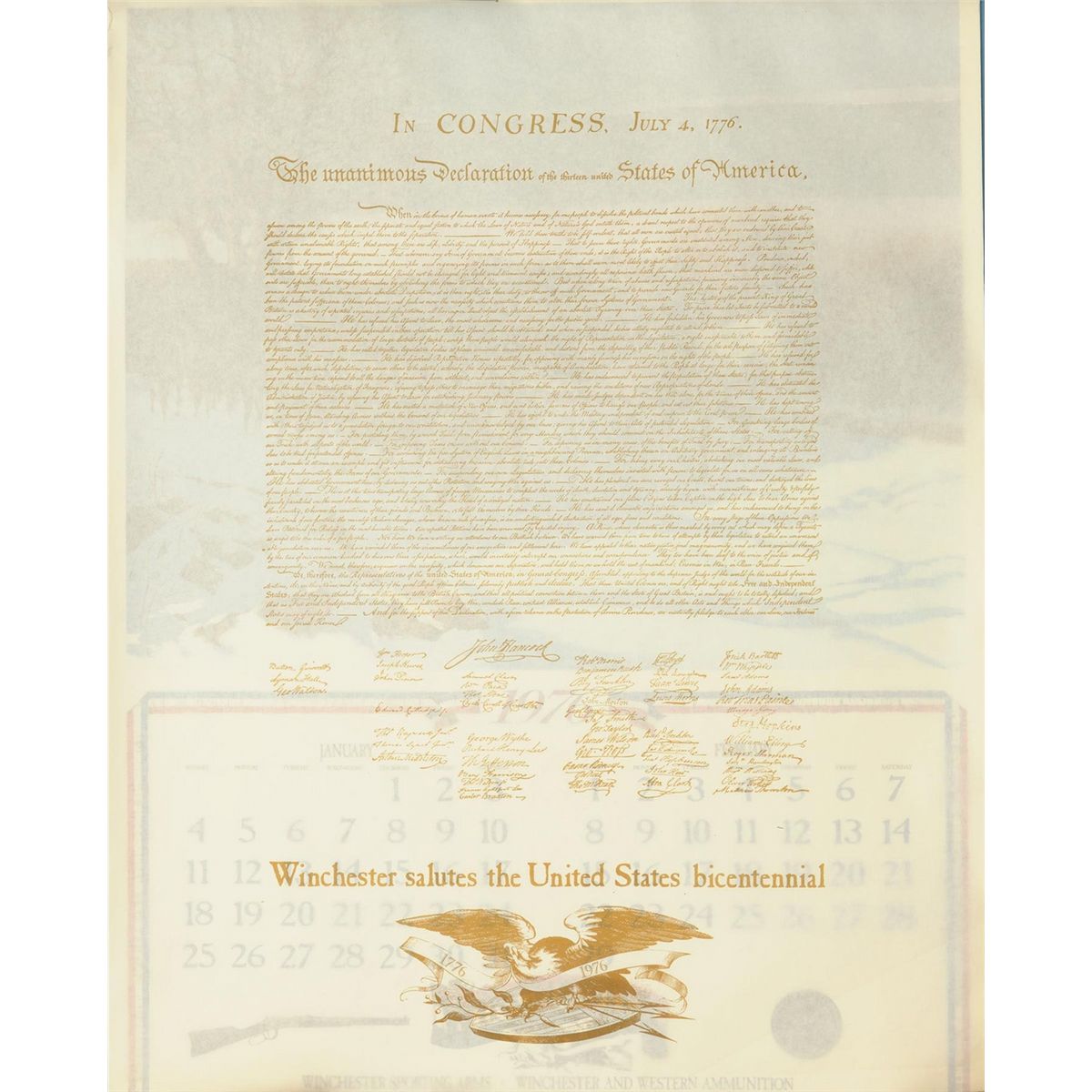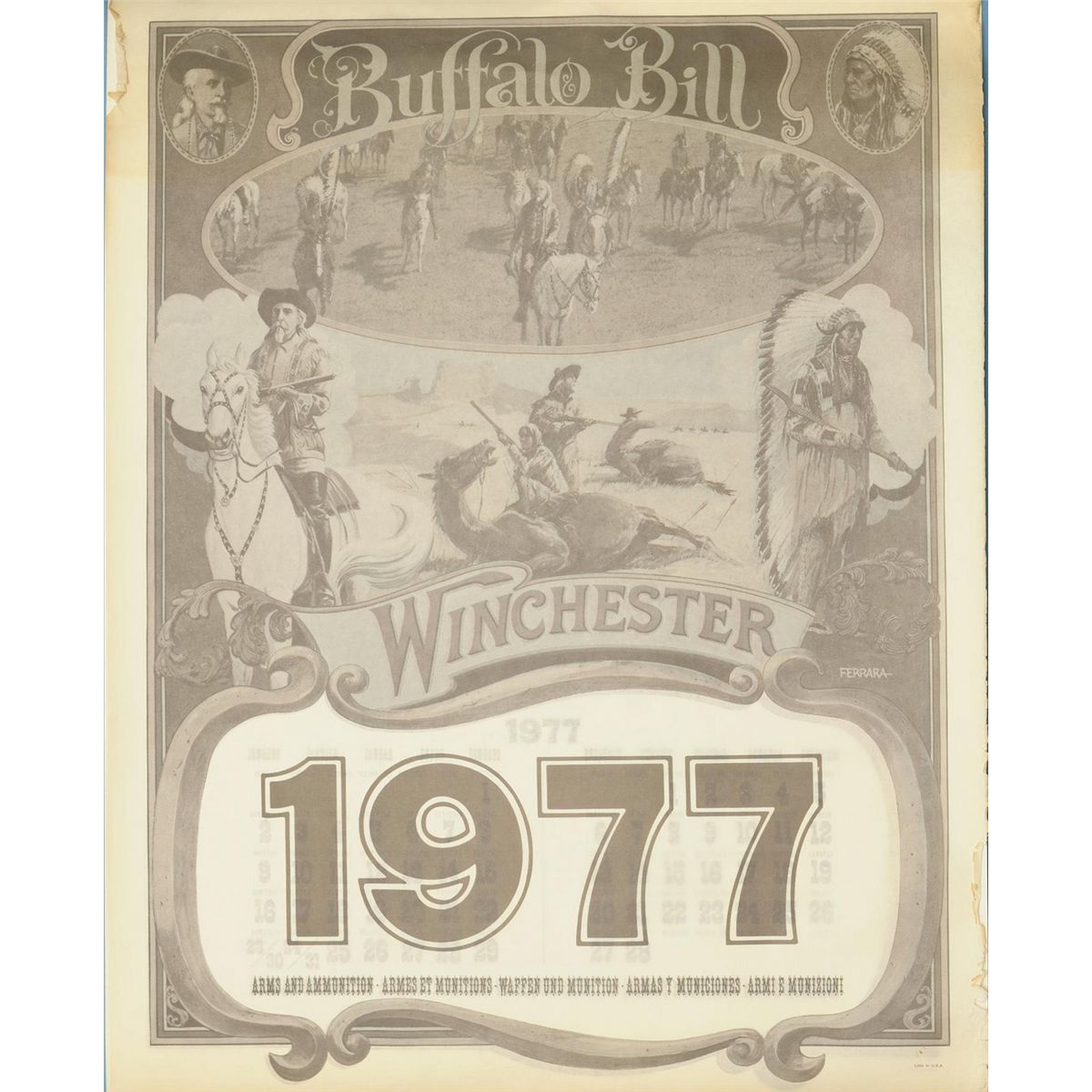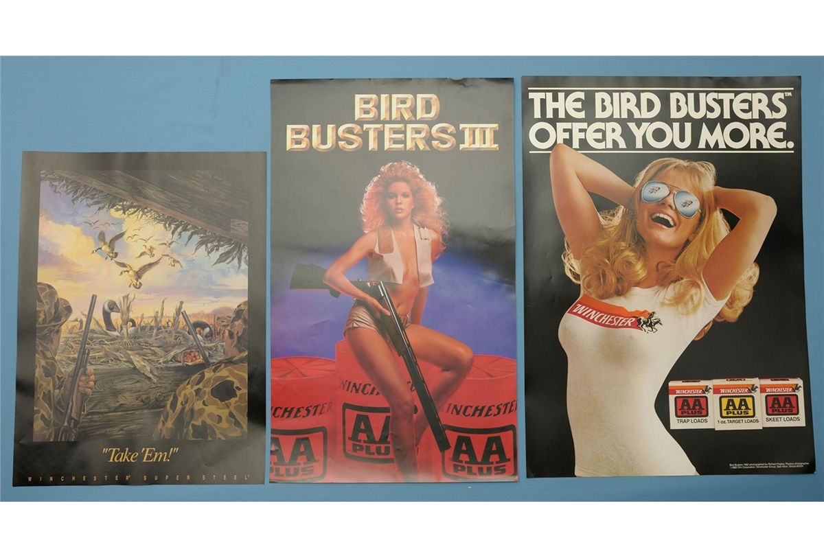 1) Winchester Bicentennial calendar (1976) in original mailing tube. 2) Winchester 1977 calendar. 3) Winchester 1977 calendar. 4) Approximately 25 Winchester super steel advertising posters titled "TAKE 'EM!" measuring 23" x 17". 5) 1 Winchester advertising poster titled "BIRD BUSTERS III" 28" X 17" 6) Approximately 33 Winchester advertising posters titled "THE BIRD BUSTERS OFFER YOU MORE" measuring 28" x 20". CONDITION: Very good to fine.