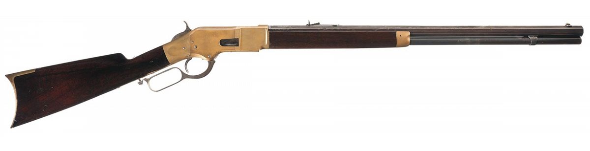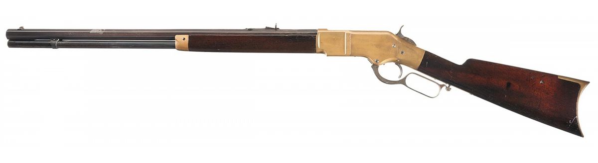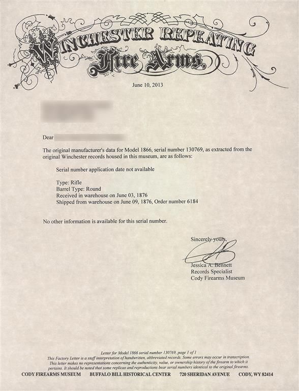 Manufactured in 1876. The rifle has a blue octagon barrel with full-length magazine. The forearm cap, receiver and crescent buttplate are brass gunmetal. The hammer and lever are casehardened. The stock and forearm are straight grain American walnut. The barrel has a sporting style front sight with nickel silver blade and sporting rear sight with checkered edges. The hammer has the later bordered knurling on the spur. The buttplate has a hinged brass trap. The top of the barrel is roll stamped with the second style legend "WINCHESTER'S-REPEATING ARMS. NEW HAVEN. CT./KING'S-IMPROVEMENT-PATENTED-MARCH 29. 1866. OCTOBER 16. 1860" ahead of the rear sight. "BROWNING BROTHERS" is stamped on the top of the barrel between the rear sight and the receiver. The Cody letter states that the rifle was originally shipped from Winchester with a round barrel. The octagon barrel presently on the rifle appears to be a period replacement installed in the Ogden, Utah, gun shop operated by John M. Browning and Jonathan Edmund Browning circa 1879. The serial number "130769" is stamped in block letters on the lower tang behind the trigger. The accompanying factory letter verifies the rifle configuration, that it was received in the warehouse on June 3, 1876 and shipped to order number 6184 on June 9, 1876.