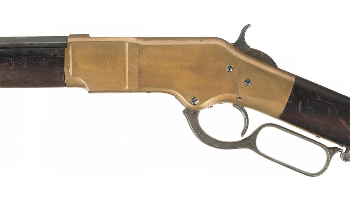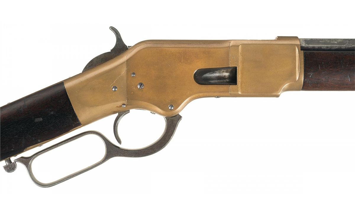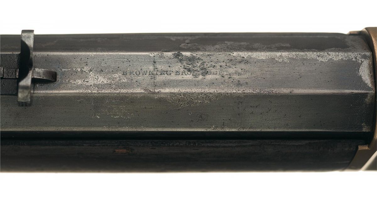 Very good. The barrel and magazine retain about 50% of the period refurbished blue finish, with the exception of the barrel. The finish has lifted in several areas on the top and sides of the barrel and there is light pitting on the exposed surfaces. The brass forearm cap, receiver and buttplate are very good with an even unpolished patina. There are light vice marks on both sides of the receiver ahead of the side plates. "44/WCF" is crudely scratched in small letters on the cartridge elevator. However, the breech bolt of the rifle has not been converted to center-fire. The stock and forearm are very good with scattered light dents and scratches. This is a solid example of a historic Winchester Third Model 1866 Rifle that was used on the frontier and had the barrel replaced by John or Ed Browning at their Ogden, Utah, gun shop.