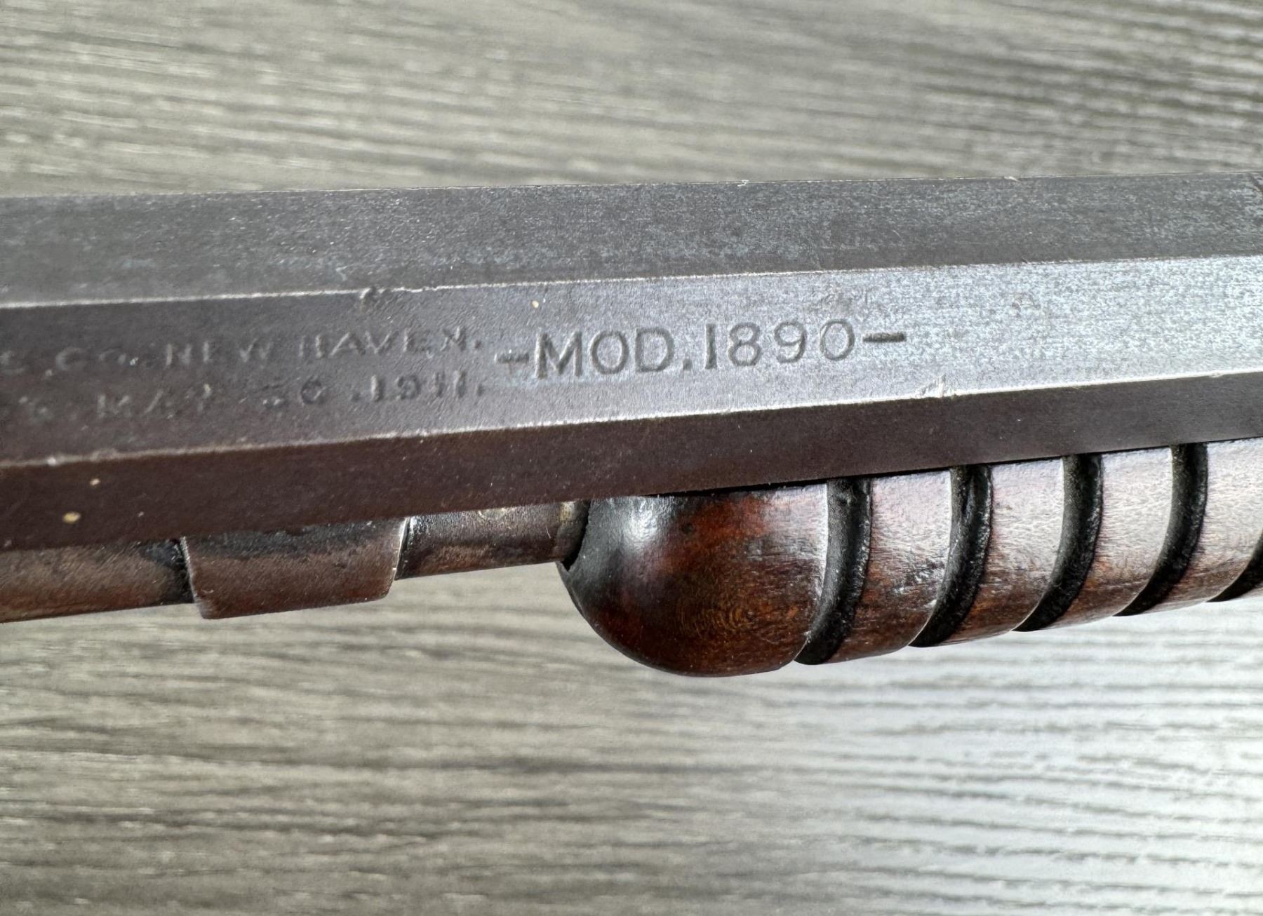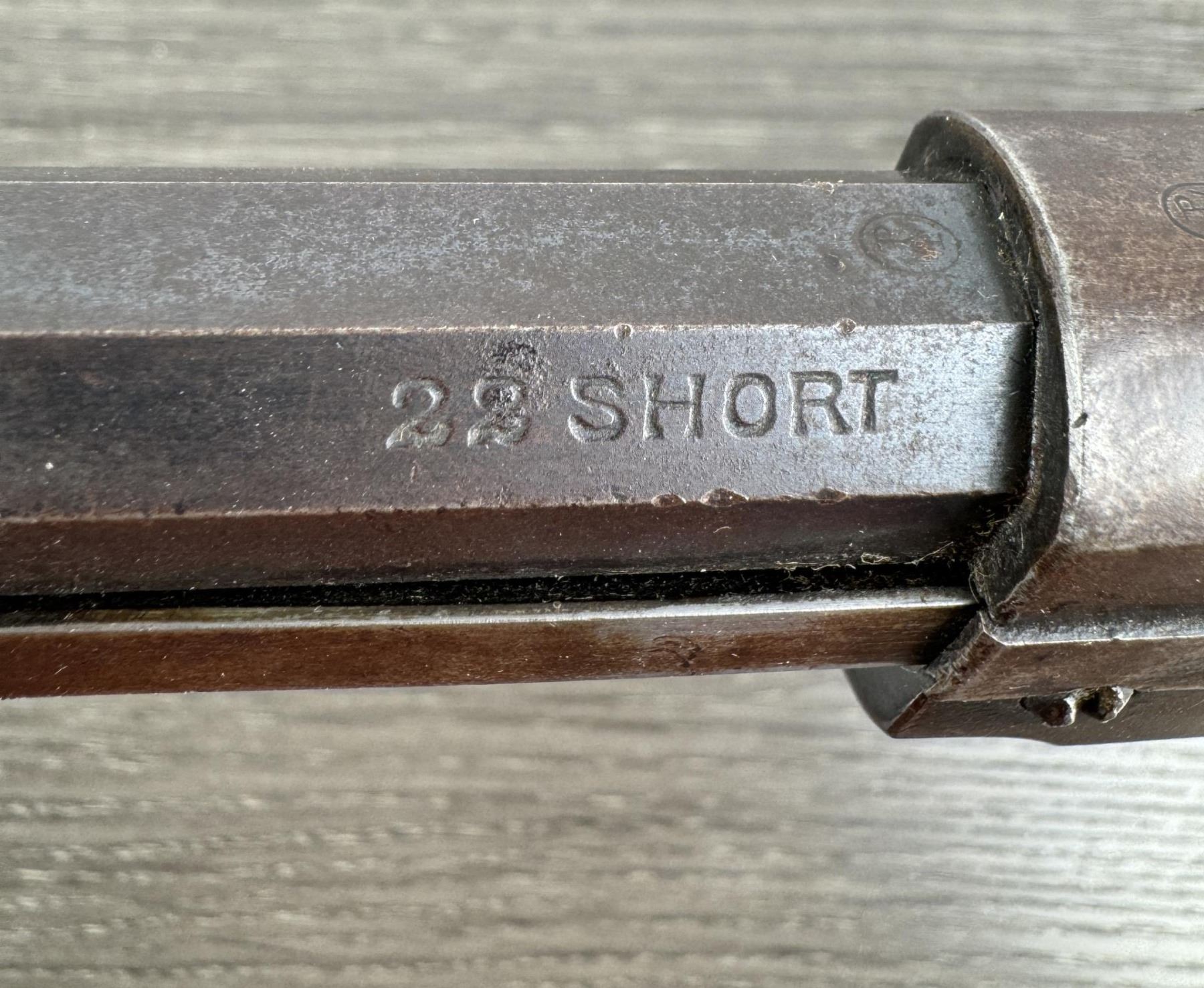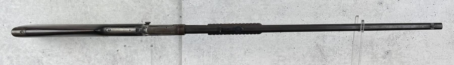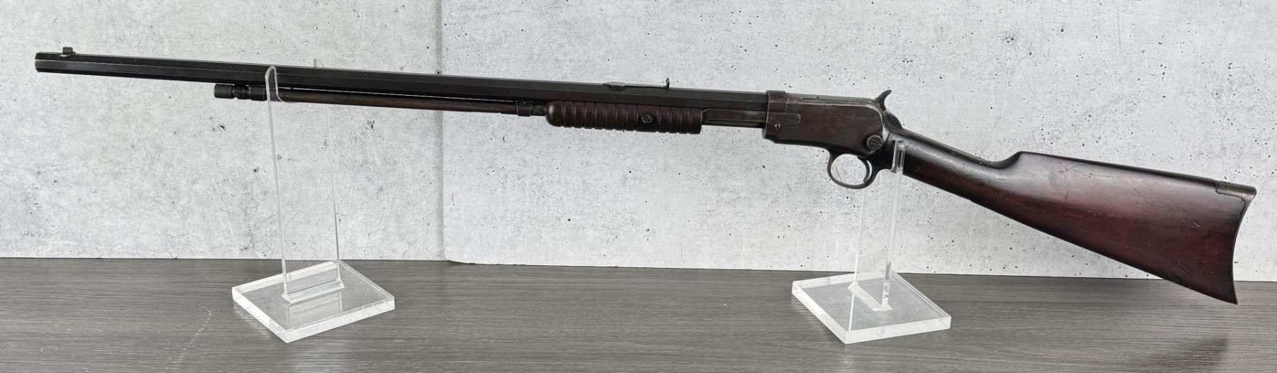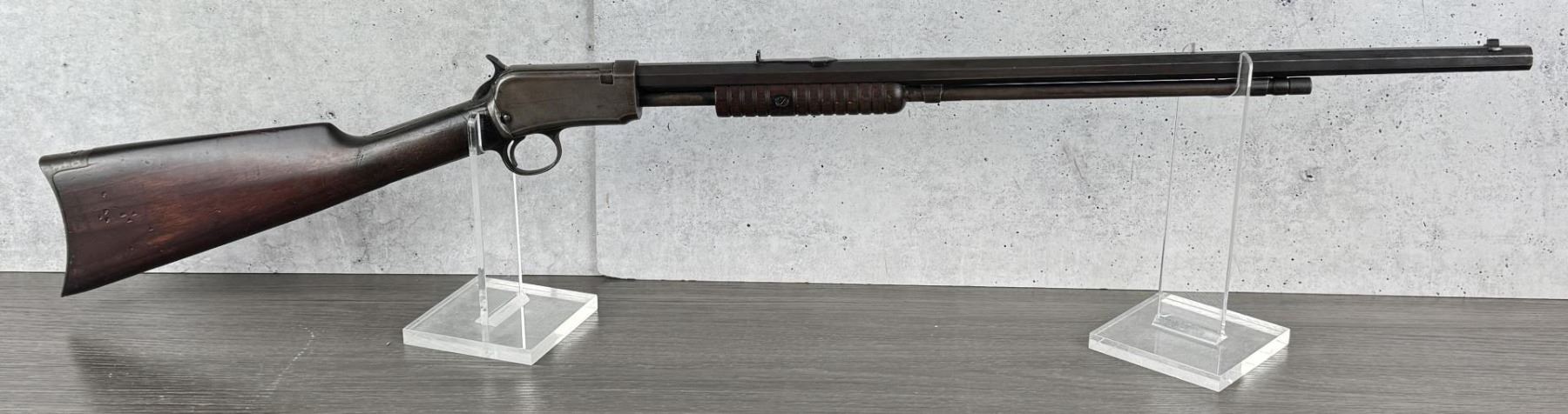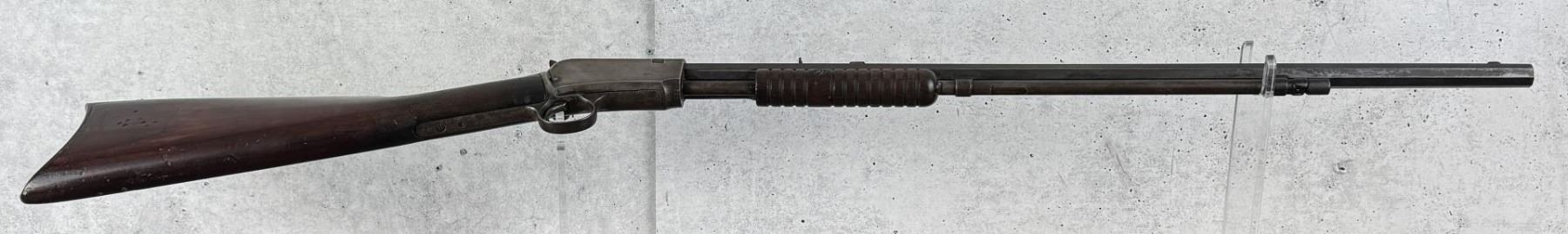 Cal. 22 Short. 24" octagon barrel. Bead front sight. D. W. King sporting rear sight missing elevator. Tubular mag. Grooved slide handle w/ straight grip walnut stock having crescent steel buttplate. Mfg. 1917. FFL Transfer Required, C&R not accepted.
