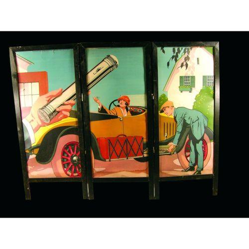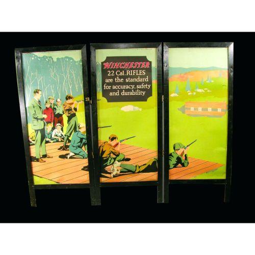 Winchester Three Panel Cardboard Window Display. C-6 Winchester ..22 caliber rifle display to be shown March 16-22/June 8-14. Extremely rare automotive shot. Tears at top, staining at bottom and a few scratches otherwise very good condition. 62 X 48 inches in original frame.