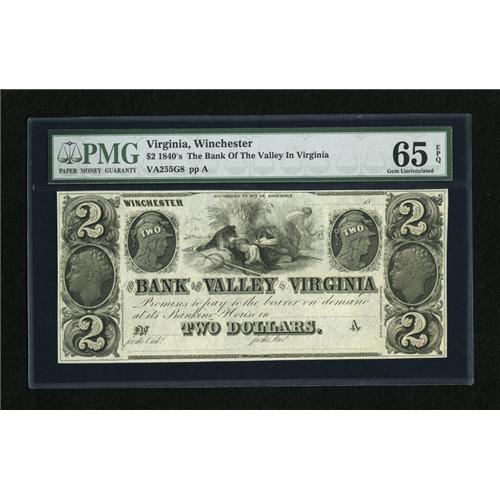 <B>Winchester, VA- Bank of the Valley</B></I> $2 18__<BR>This scarce denomination last appeared in one of our auctions in 2005. This piece is bold, original, and graded <B>PMG Gem Uncirculated 65 EPQ.</B></I><BR><BR><b>Shipping:</b> Coins & Currency (<a target="_blank" href="http://www.heritageauctions.com/common/shipping.php">view shipping information</a>)