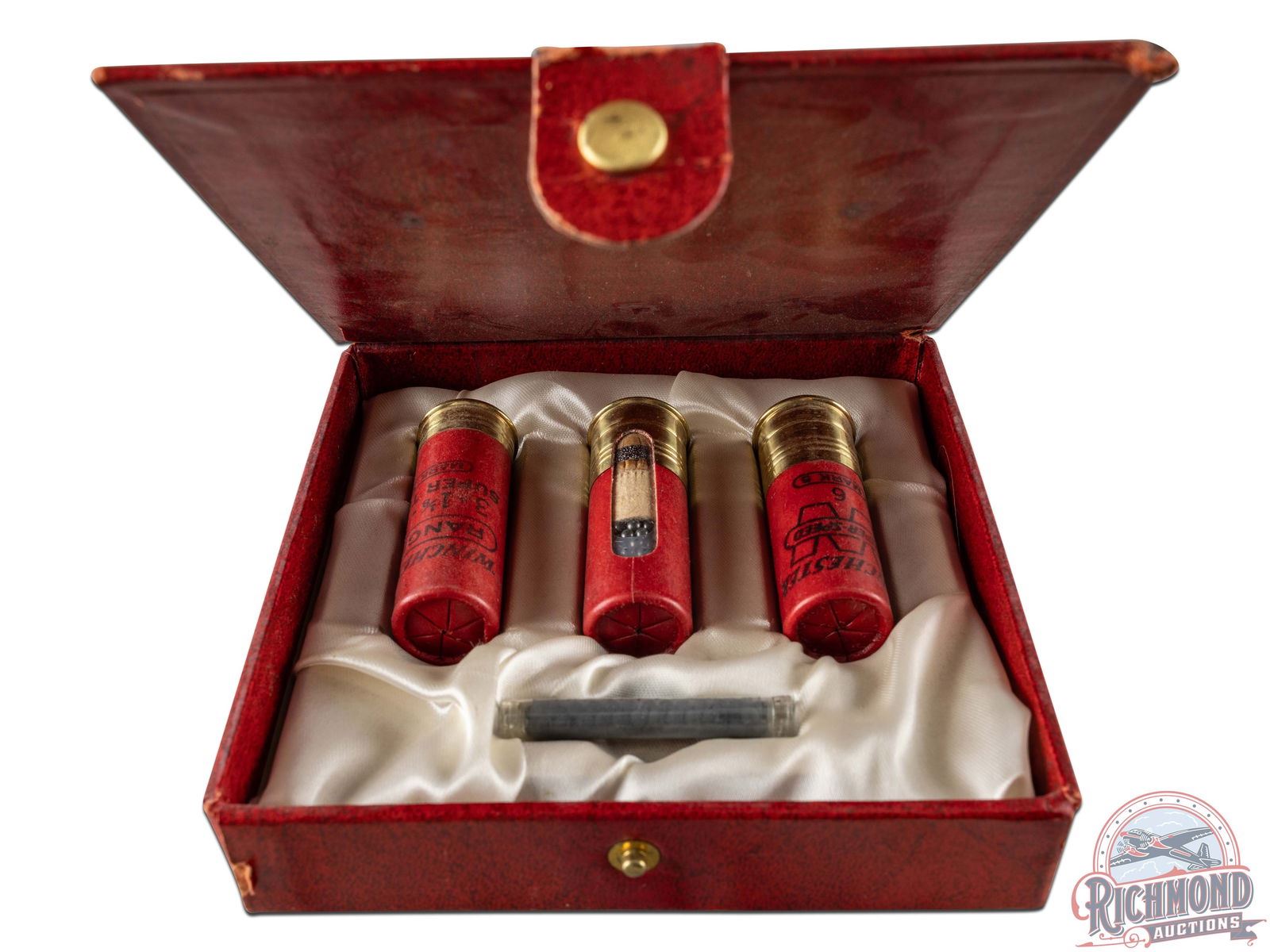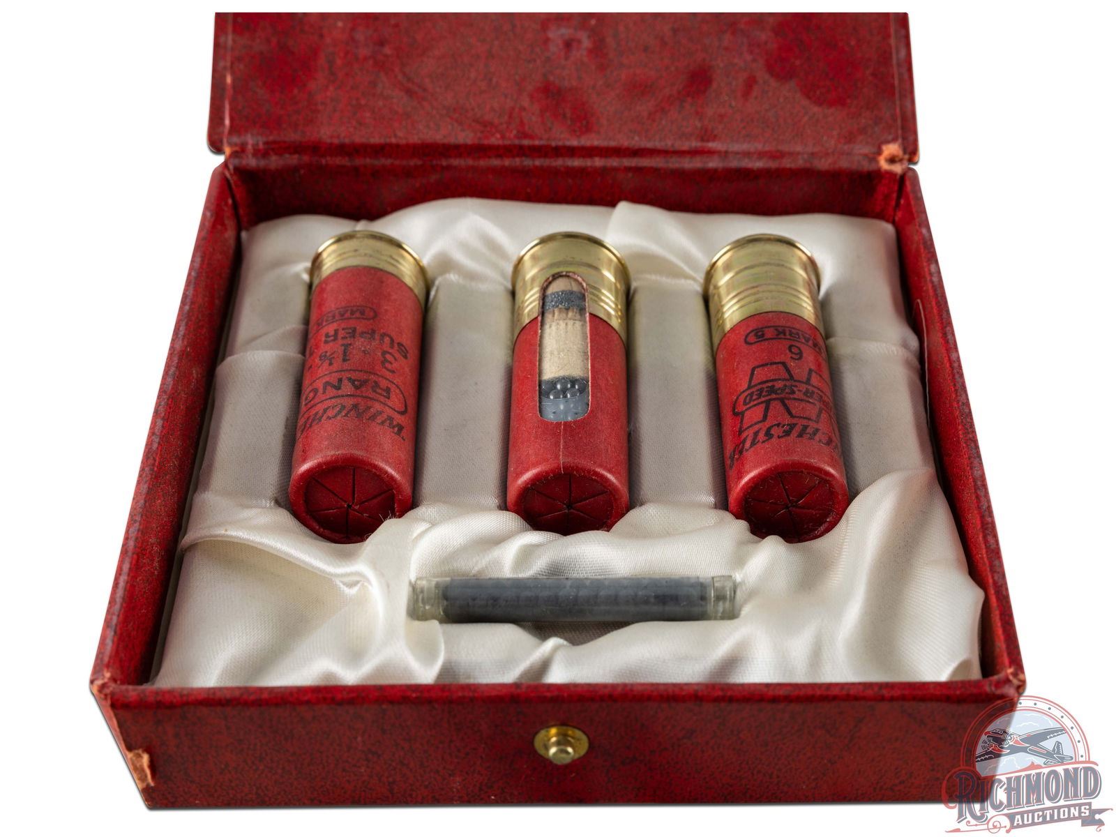 1950's vintage Winchester Salesman kit showcasing Winchester "Super Speed and Ranger" SuperSeal Crimped Shotgun shells with two SuperSpeed Window shells and a Super Trap Ranger shell, all with "Mark 5" marking in satin lined fitted red cardboard case with glass shot display tube.