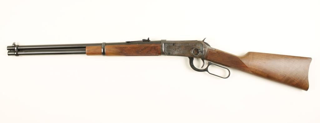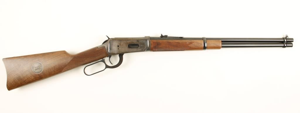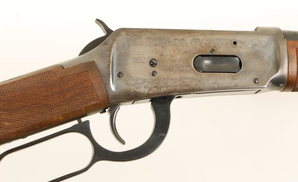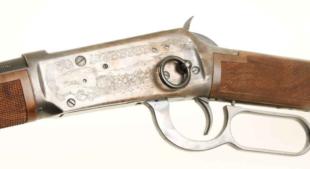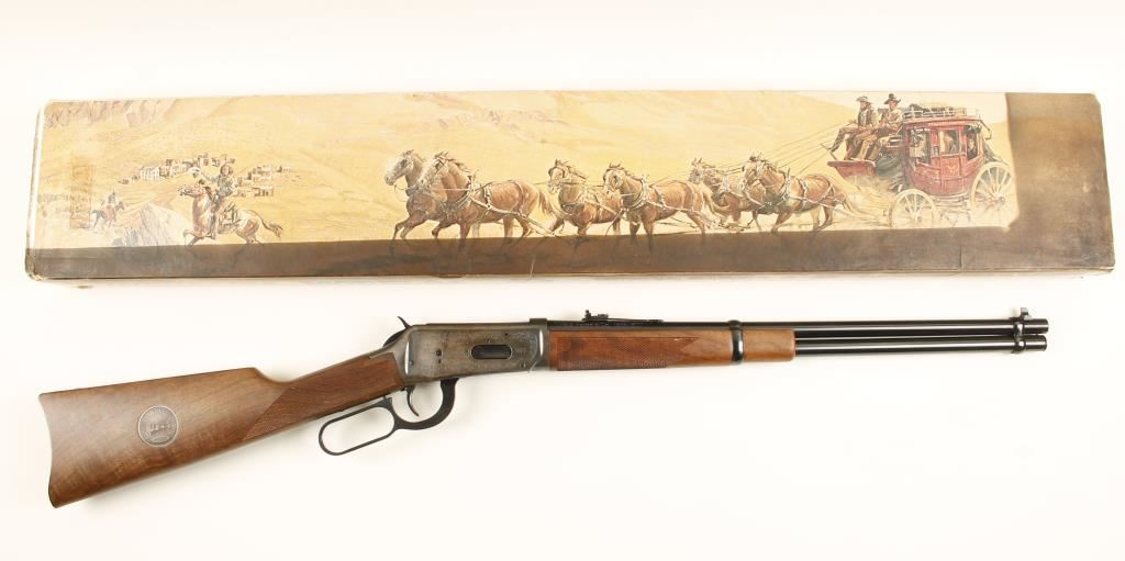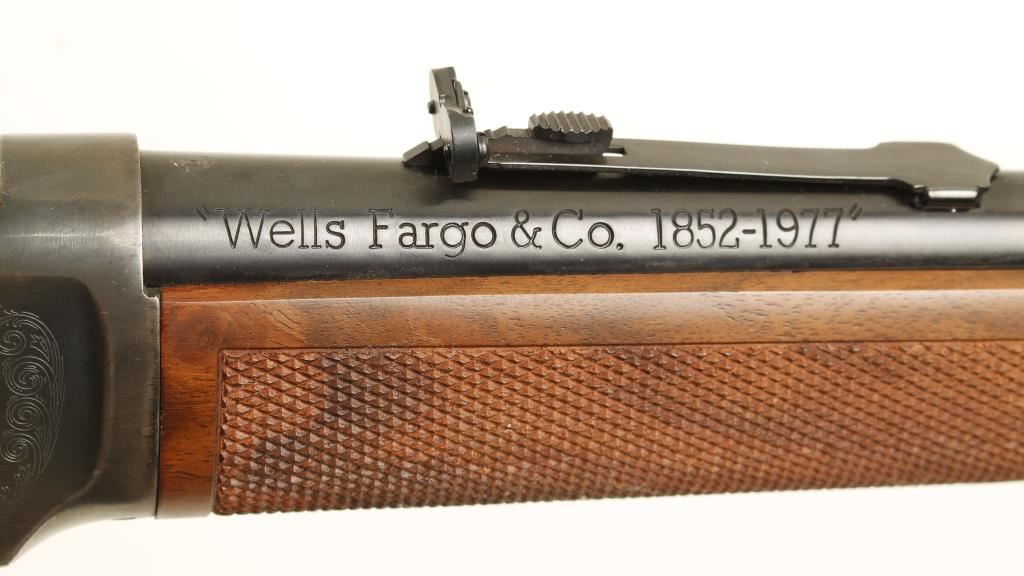 SN: 0646. 20" blued barrel with bright bore. Tarnished stainless steel finish on receiver engraved "W.F. & Co. 1852 1977" with bank scene and scroll one one side, stagecoach scene with scroll border on the other. Checkered stock with Wells Fargo medallion embedded in it. Overall condition is excellent in box. *Modern Firearm*
